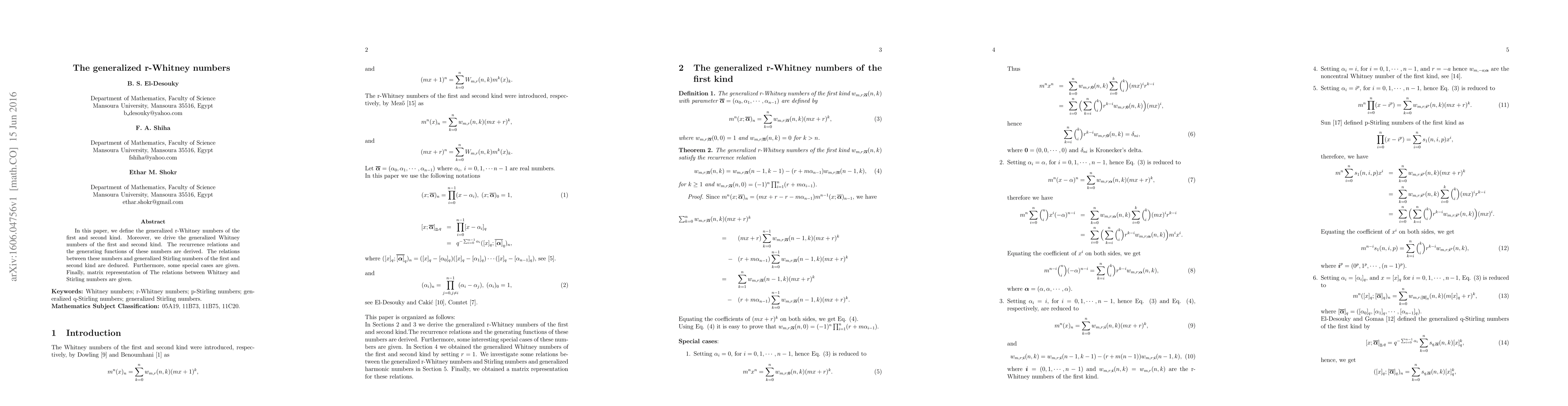 This paper defines generalized r-Whitney numbers of the first and second kind, deriving their recurrence relations, generating functions, and connections to generalized Stirling numbers. It also presents special cases and a matrix representation linking Whitney and Stirling numbers.