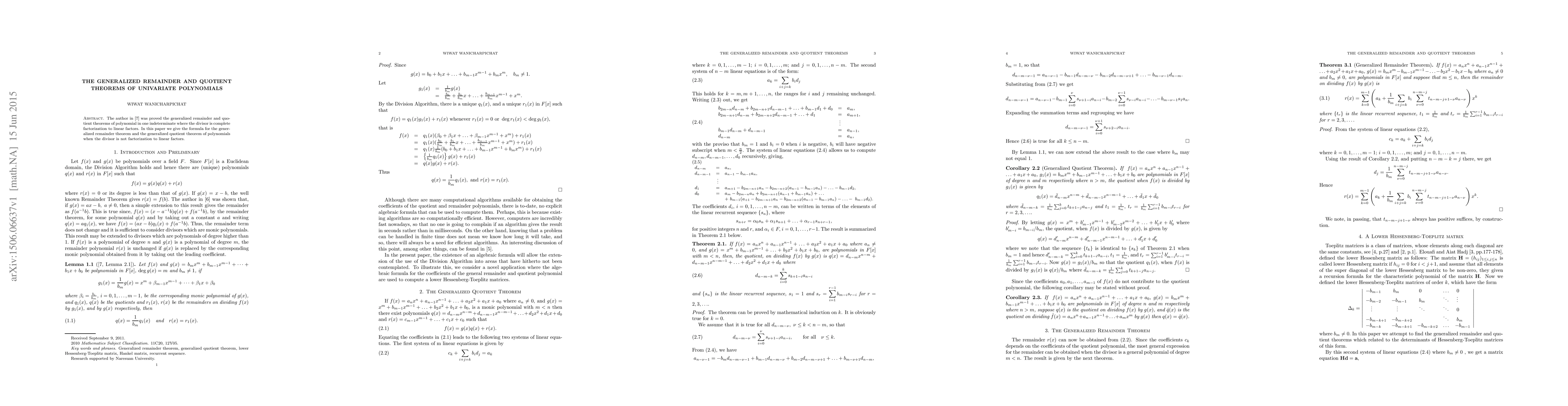 This paper extends previous work on the Remainder and Quotient Theorems for polynomials, providing formulas for cases where the divisor is not completely factored into linear factors. It builds upon earlier research, generalizing the theorems for more complex divisors.