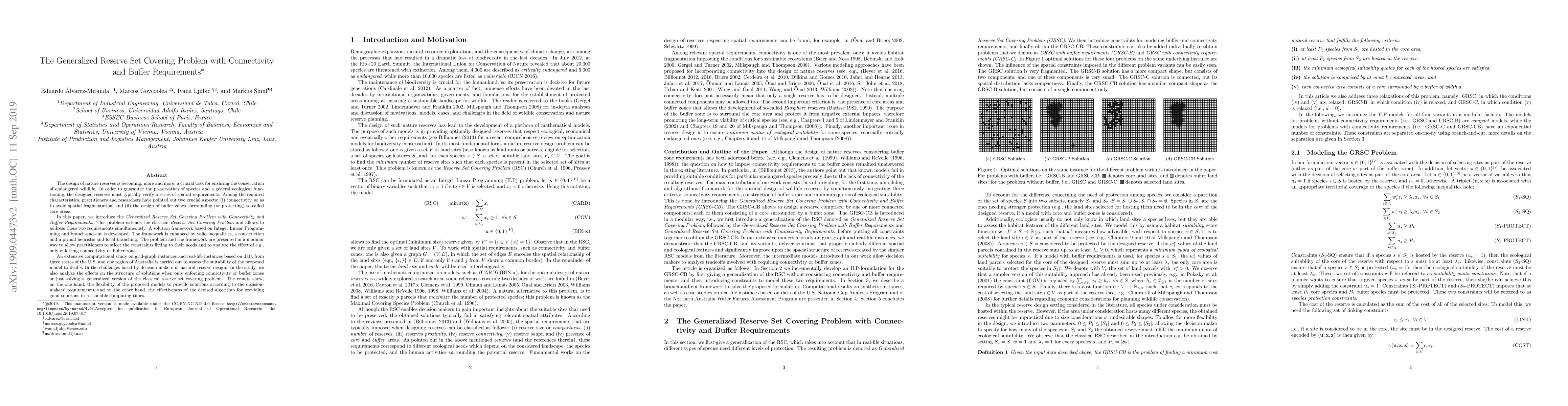 This paper introduces the Generalized Reserve Set Covering Problem with Connectivity and Buffer Requirements, extending the classical problem to address species conservation needs. It presents an Integer Linear Programming framework with branch-and-cut, enriched by valid inequalities, heuristics, and local branching. The methodology is tested on grid-graph and real-life instances from U.S. states and Australian regions, demonstrating the model's flexibility and algorithm's effectiveness in providing suitable solutions within reasonable computing times.