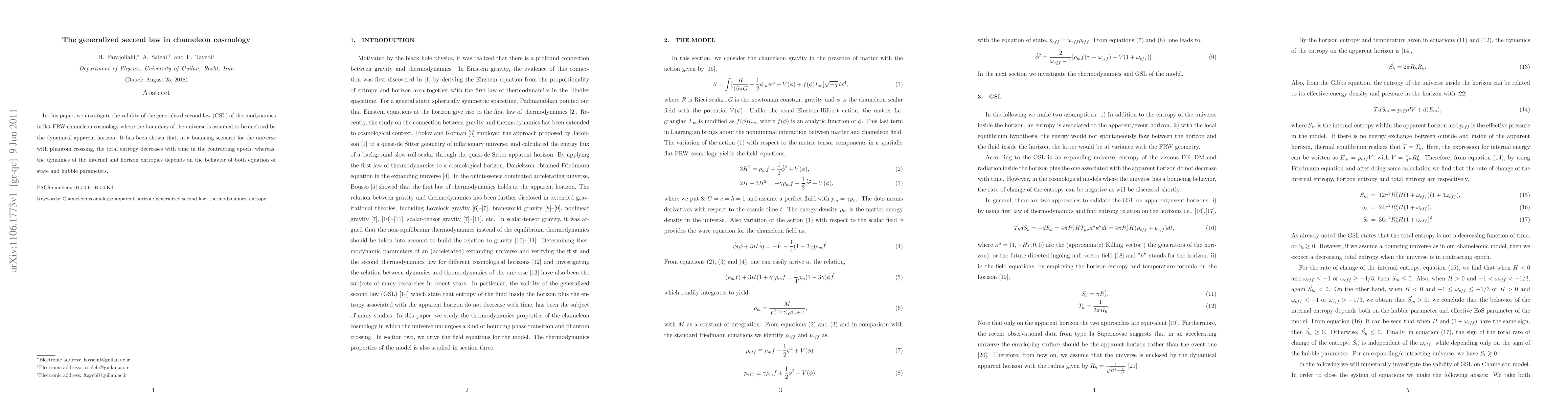 The paper presents a detailed analysis of the GSL in chameleon cosmology, considering both internal and horizon entropies, and their dependence on Hubble parameter and effective equation of state.