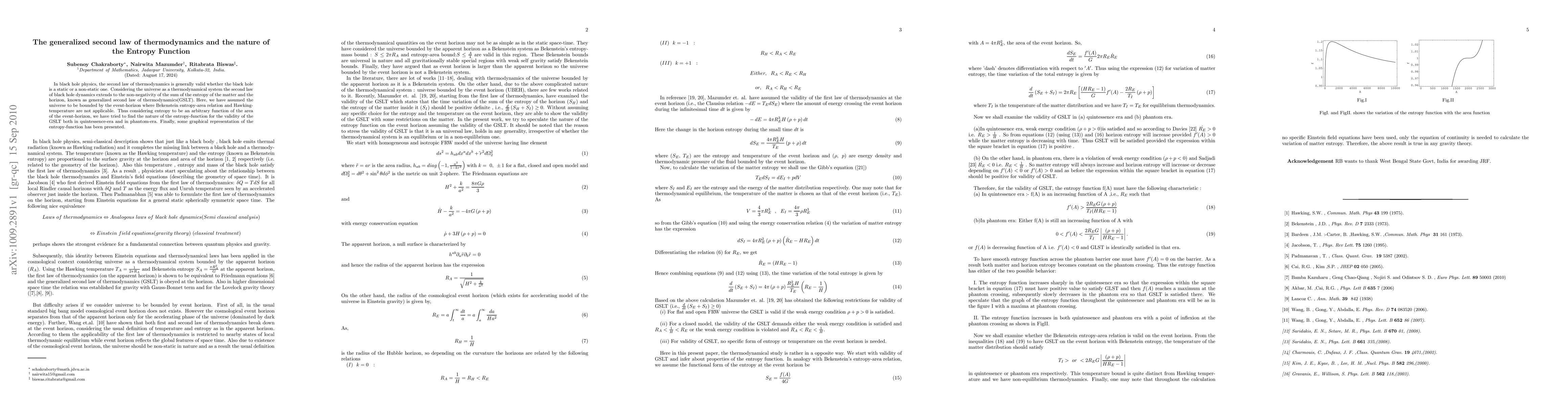 This paper investigates the generalized second law of thermodynamics (GSLT) in black hole physics and the universe, focusing on the nature of the entropy function. It explores the validity of GSLT under different cosmological eras, quintessence and phantom, and presents graphical representations of the entropy function.