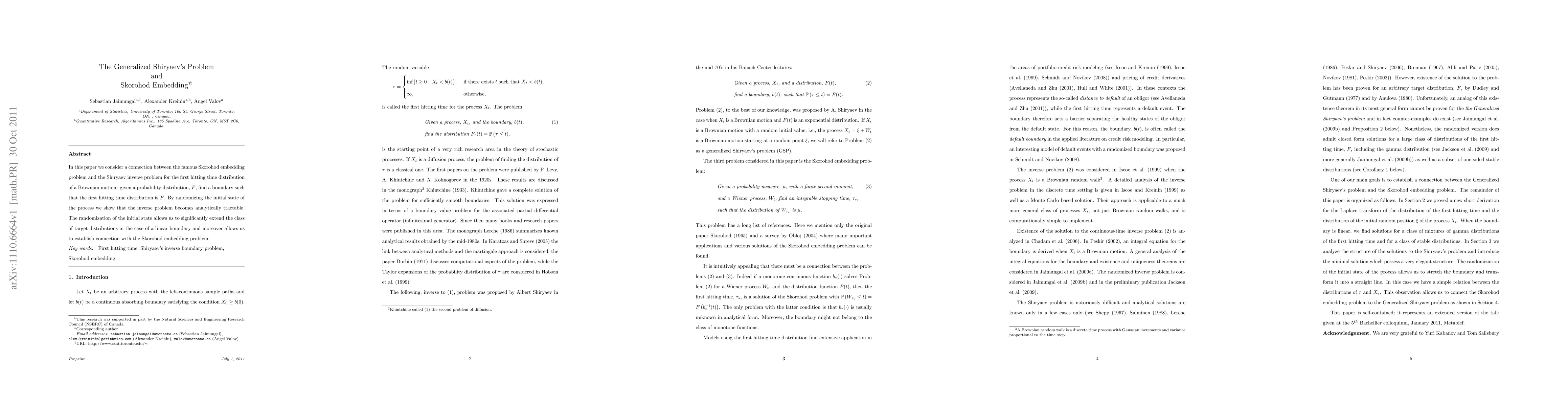This paper explores the link between the Skorohod embedding problem and the Shiryaev inverse problem concerning the first hitting time distribution of Brownian motion. By randomizing the initial state, the authors make the inverse problem analytically tractable and extend the class of target distributions, establishing a connection with the Skorohod embedding problem.