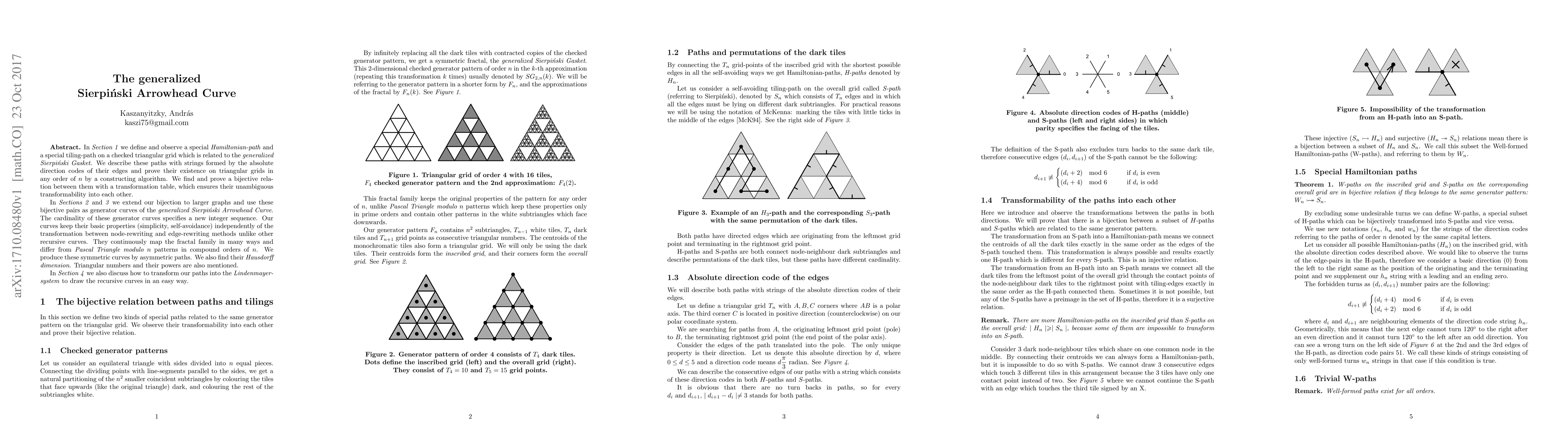 We define special Hamiltonian-paths and special permutations of the up-facing dark tiles on a checked triangular grid related to the generalized Sierpi\'{n}ski Gasket. Our definitions and observations make possible the generalization of the Sierpi\'{n}ski Arrowhead Curve for all orders. We produce these symmetric recursive curves in many ways by two kinds of asymmetric paths which are in a bijective relation and unambiguously transformable into each other in any order. These node-rewriting and edge-rewriting recursive curves keep their self-avoiding and simple properties after the transformation and their cardinality specifies a new integer sequence. We show a transformation table to change the curves into each other and we give another table to change them into Lindenmayer-system strings both by the absolute direction codes of their edges.