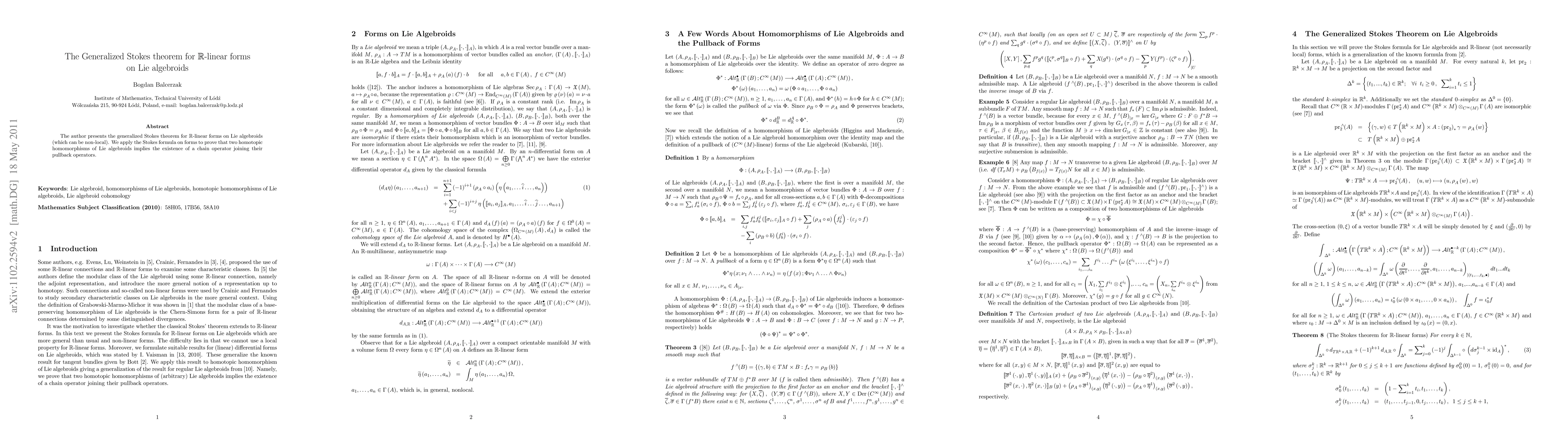 Summary: The paper establishes a generalized Stokes theorem for R-linear forms on Lie algebroids and demonstrates that homotopic homomorphisms of these structures yield a chain operator linking their respective pullback operators.