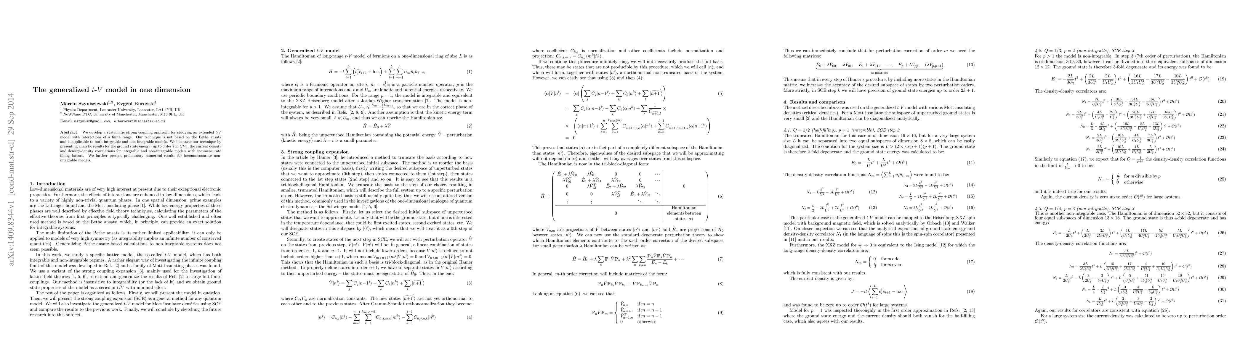 We develop a systematic strong coupling approach for studying an extended t-V model with interactions of a finite range. Our technique is not based on the Bethe ansatz and is applicable to both integrable and non-integrable models. We illustrate our technique by presenting analytic results for the ground state energy (up to order 7 in t/V), the current density and density-density correlations for integrable and non-integrable models with commensurate filling factors. We further present preliminary numerical results for incommensurate non-integrable models.