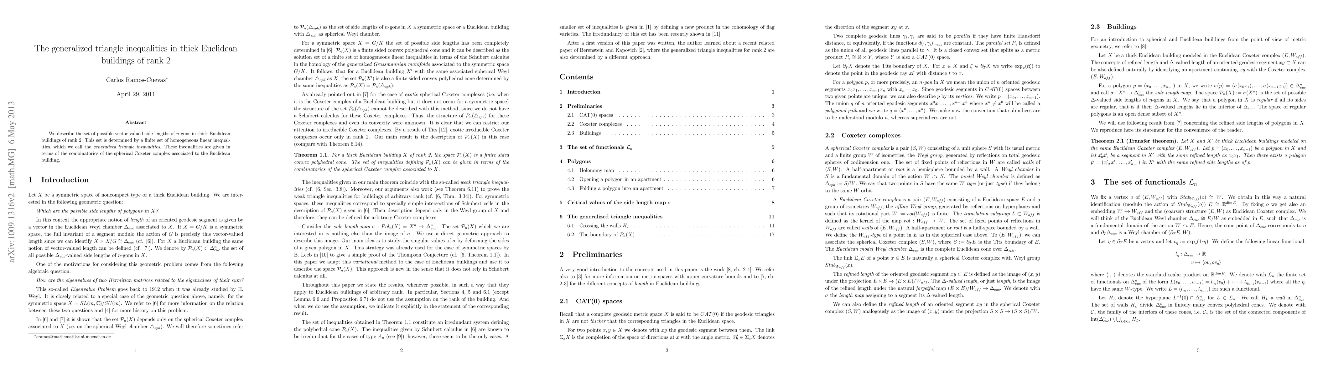 Summary: This paper investigates the generalized triangle inequalities governing the vector-valued side lengths of n-gons in thick Euclidean buildings of rank 2, characterized by a finite set of homogeneous linear inequalities derived from the combinatorics of the associated spherical Coxeter complex.