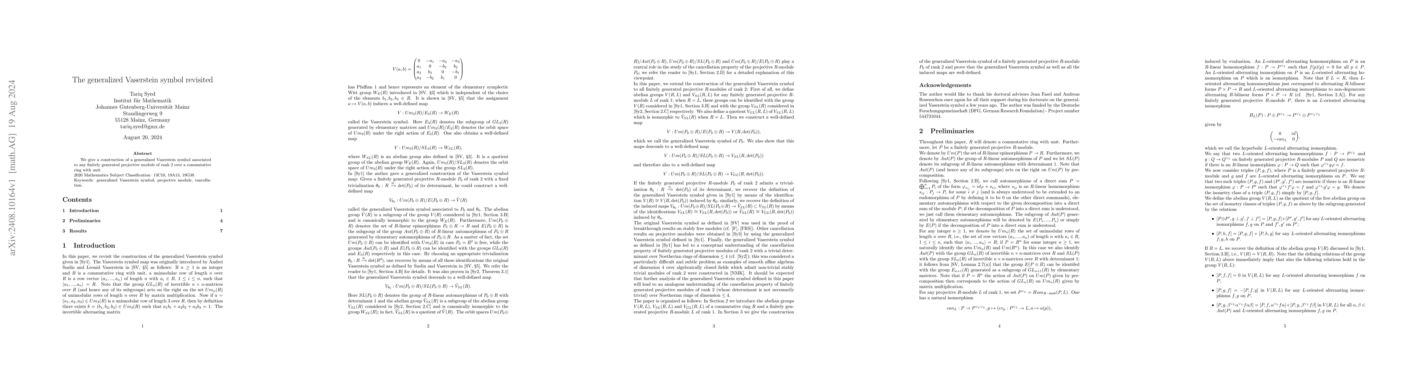 The paper introduces and studies the generalized Vaserstein symbol and related abelian groups V(R, L), VSL(R, L), and VGL(R, L), providing a detailed construction and proving their well-definedness.