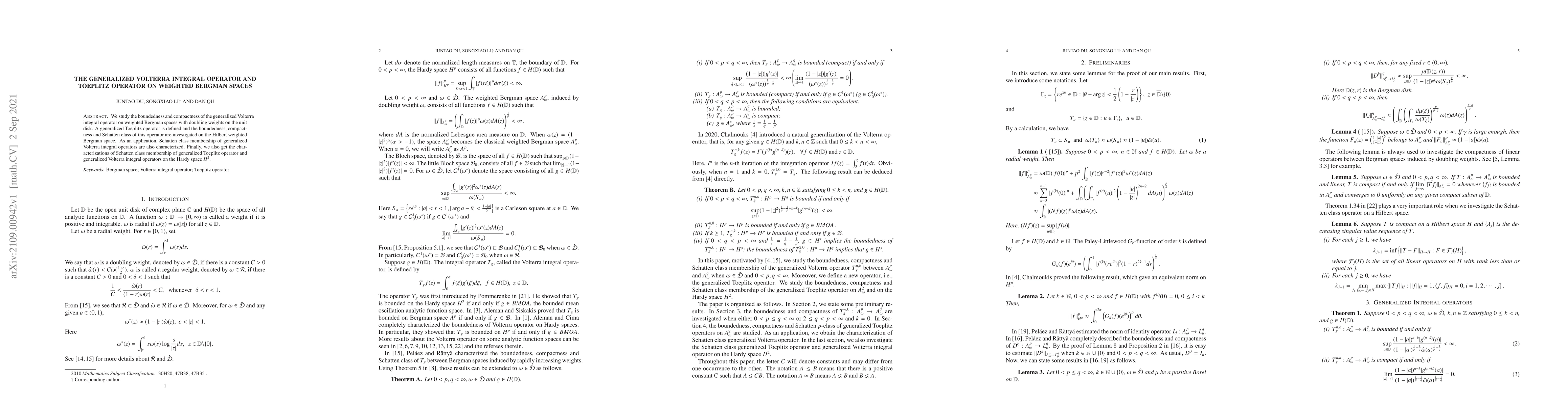 We study the boundedness and compactness of the generalized Volterra integral operator on weighted Bergman spaces with doubling weights on the unit disk. A generalized Toeplitz operator is defined and the boundedness, compactness and Schatten class of this operator are investigated on the Hilbert weighted Bergman space. As an application, Schatten class membership of generalized Volterra integral operators are also characterized. Finally, we also get the characterizations of Schatten class membership of generalized Toeplitz operator and generalized Volterra integral operators on the Hardy space $H^2$.
