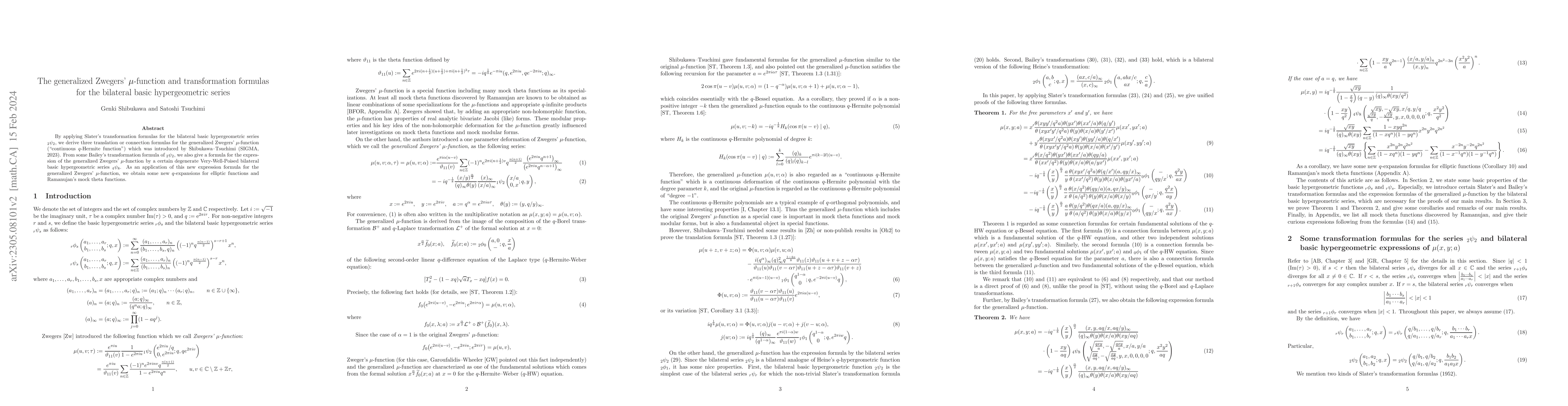By applying Slater's transformation formulas for the bilateral basic hypergeometric series ${}_2\psi_{2}$, we derive three type translation formulas for the generalized Zwegers' $\mu$-function (``continuous $q$-Hermite function'') which was introduced by Shibukawa--Tsuchimi (SIGMA, 2023). From some Bailey's transformation formula of ${}_2\psi_{2}$, we also give a formula for the expression of the generalized Zwegers' $\mu$-function by some very-well-poised bilateral basic hypergeometric series ${}_4\psi_{8}$. As an application of this new expression formula for the generalized Zwegers' $\mu$-function, we obtain some new Fourier expansions for the Weierstrass and Jacobi elliptic functions.