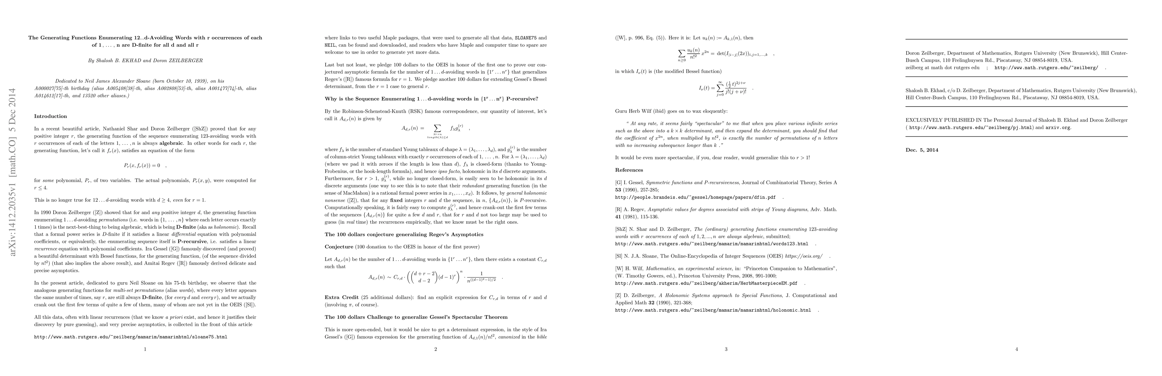 In this article, dedicated with admiration and gratitude to guru Neil Sloane on his 75-th birthday, we observe that the generating functions for multi-set permutations that do not contain an increasing subsequence of length d, and where every letter appears the same number of times, say r, are always D-finite, (for every d and every r), and we actually crank out the first few terms of quite a few of them, many of whom are not yet in the OEIS. We also state a conjectured asymptotic formula for these sequences, that reduces to Amitai Regev's famous formula when r=1, and pledge a 100 dollar donation to the OEIS in honor of the first one to prove our conjecture. We pledge another 100 dollars for extending Ira Gessel's spectacular Bessel determinant, from the r=1 case to general r.