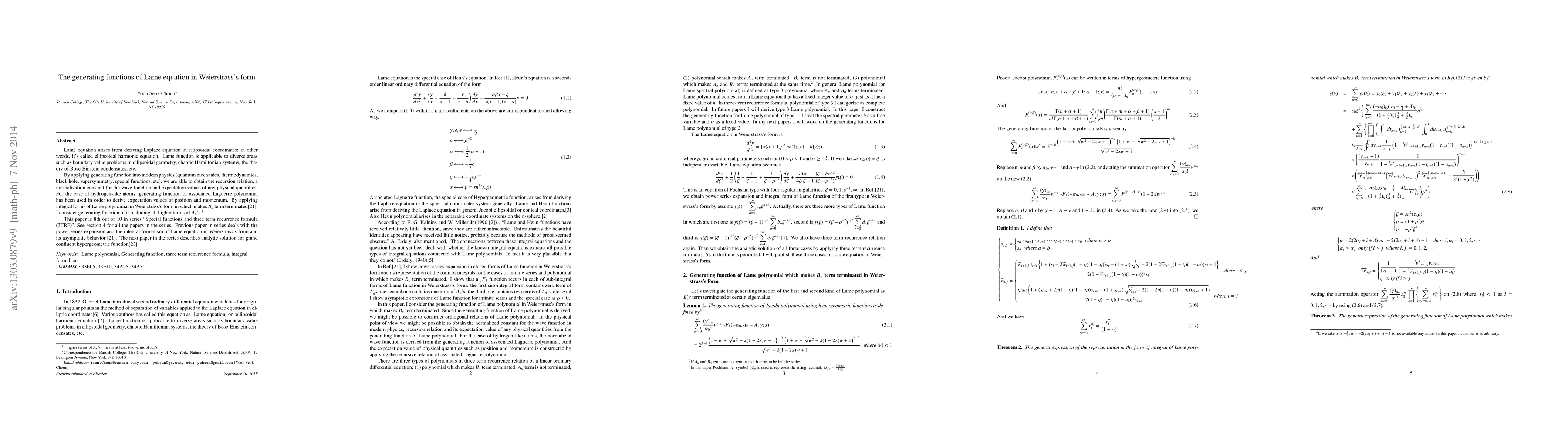This paper explores the generating functions of the Lame equation in Weierstrass's form, focusing on the recursion relation and normalization constants for the wave function. It extends previous work on the power series expansion and integral forms, aiming to derive expectation values for physical quantities in diverse fields like quantum mechanics and Bose-Einstein condensates.