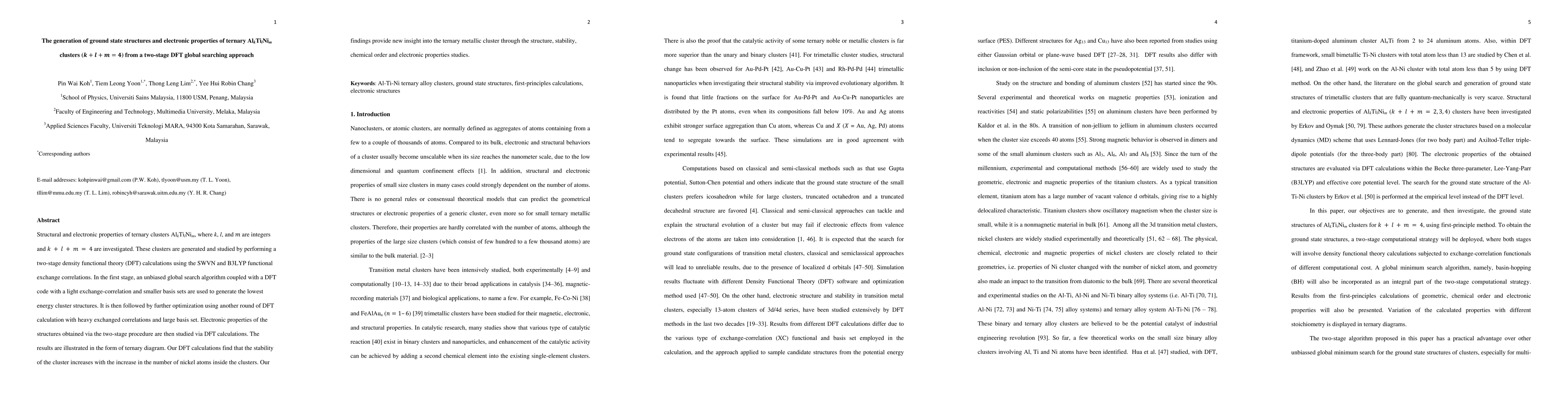 This paper investigates the structural and electronic properties of ternary AlkTilNim clusters (k+l+m=4) using a two-stage DFT approach. The study finds that cluster stability increases with more nickel atoms, providing insights into the structure, stability, chemical order, and electronic properties of these clusters.