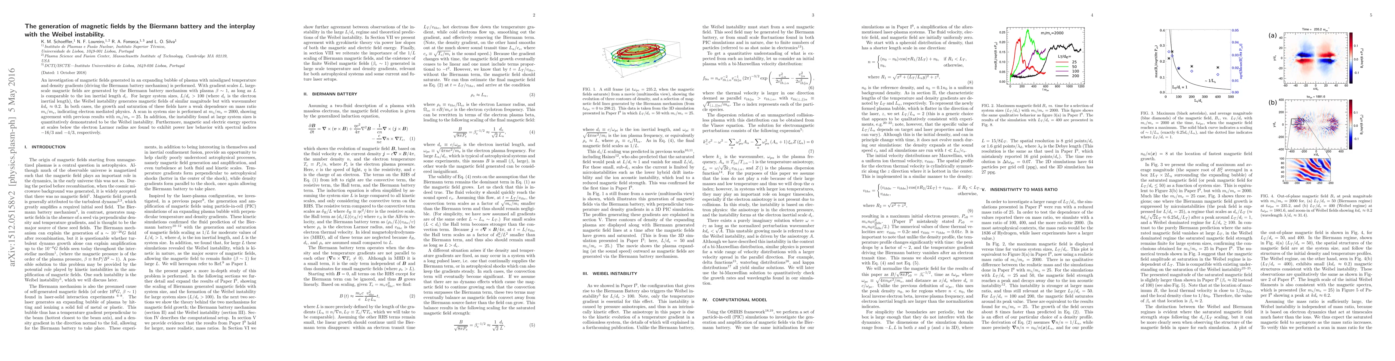 This paper investigates magnetic field generation in plasma through the Biermann battery mechanism and the Weibel instability, showing that both mechanisms produce comparable magnetic fields under different conditions. The study finds that the Biermann battery is effective for comparable gradient scales, while the Weibel instability dominates at larger scales, with a weak dependence on mass ratio, indicating electron-mediated dynamics.