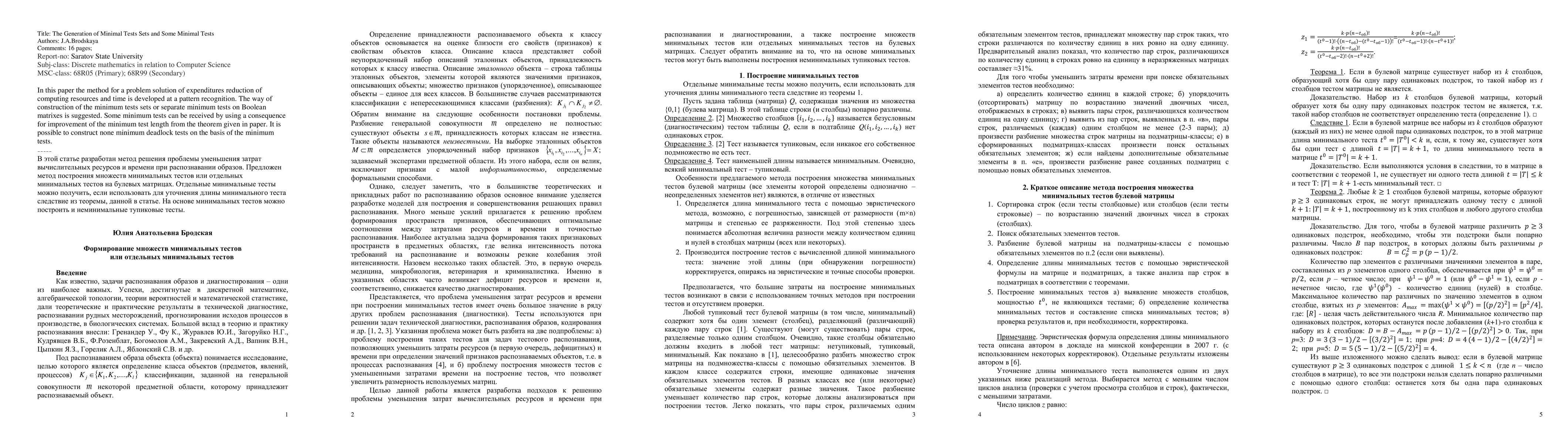 The method for a problem solution of expenditures reduction of computing resources and time is developed at a pattern recognition, with the way of construction of the minimum tests sets or separate minimum tests on Boolean matrixes is suggested