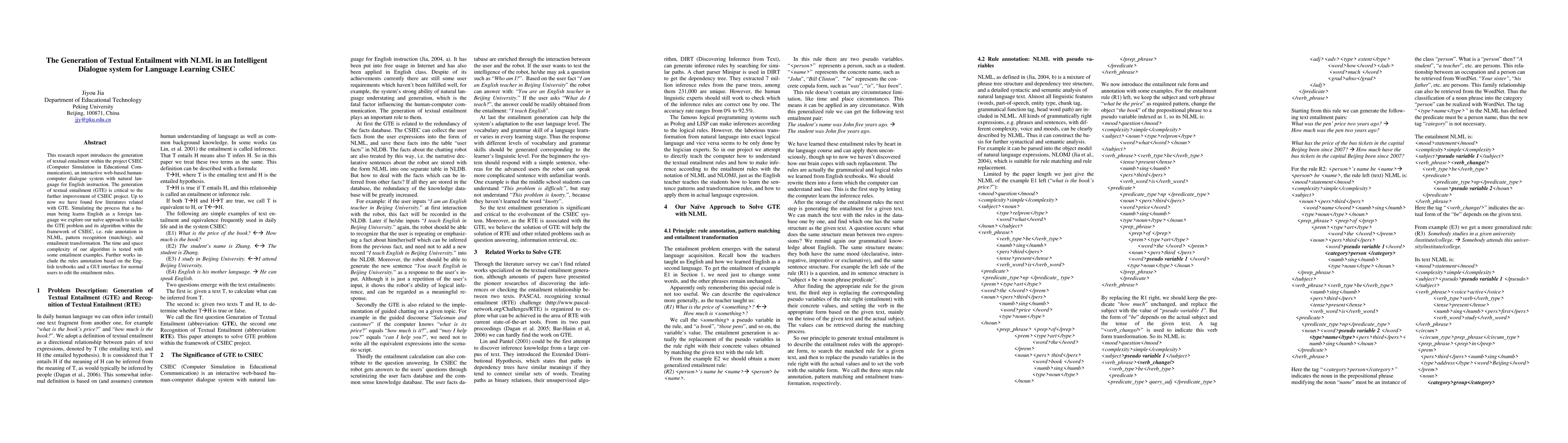 This research paper introduces a new approach to generate textual entailment in an intelligent dialogue system for language learning, using rule annotation, pattern recognition, and entailment transformation. The goal is to improve the interactive web-based human-computer dialogue system.