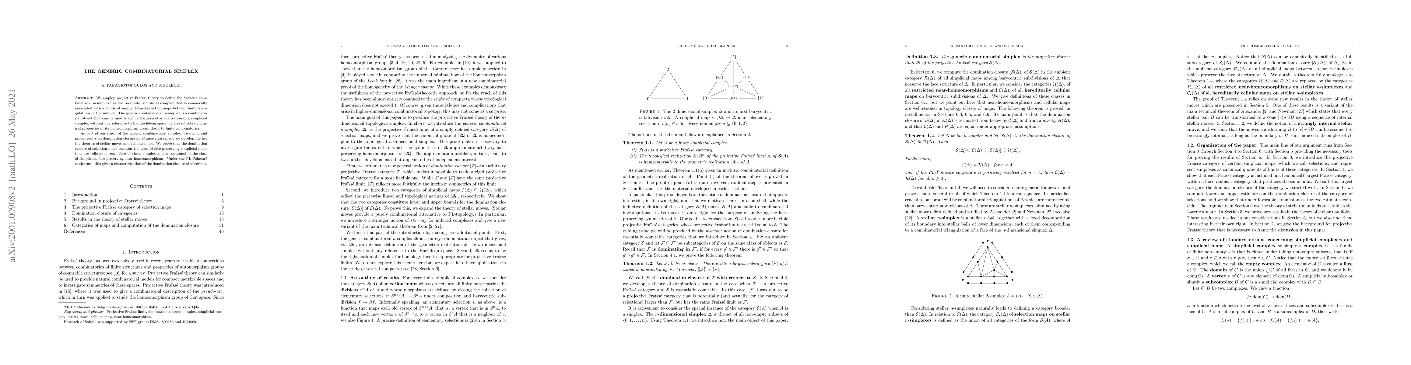 We employ projective Fra\"iss\'e theory to define the "generic combinatorial $n$-simplex" as the pro-finite, simplicial complex that is canonically associated with a family of simply defined selection maps between finite triangulations of the simplex. The generic combinatorial $n$-simplex is a combinatorial object that can be used to define the geometric realization of a simplicial complex without any reference to the Euclidean space. It also reflects dynamical properties of its homeomorphism group down to finite combinatorics. As part of our study of the generic combinatorial simplex, we define and prove results on domination closure for Fra\"iss\'e classes, and we develop further the theories of stellar moves and cellular maps. We prove that the domination closure of selection maps contains the class of face-preserving simplicial maps that are cellular on each face of the $n$-simplex and is contained in the class of simplicial, face-preserving near-homeomorphisms. Under the PL-Poincar\'e conjecture, this gives a characterization of the domination closure of selections.