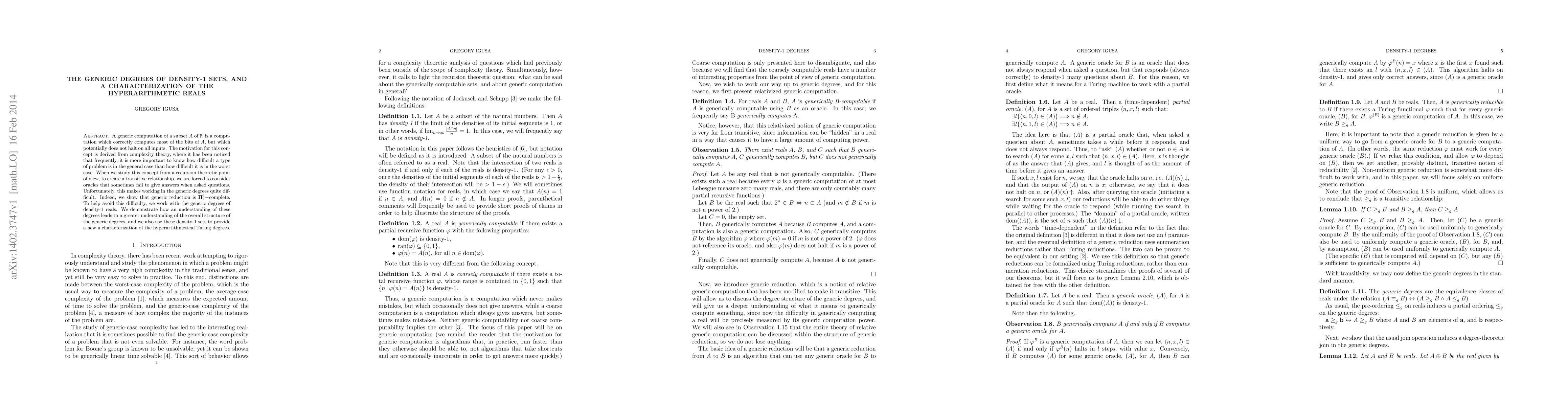 Researchers explore the concept of generic degrees of density-1 sets to better understand the structure of generic degrees in recursion theory. They demonstrate how this understanding leads to a characterization of hyperarithmetical Turing degrees.
