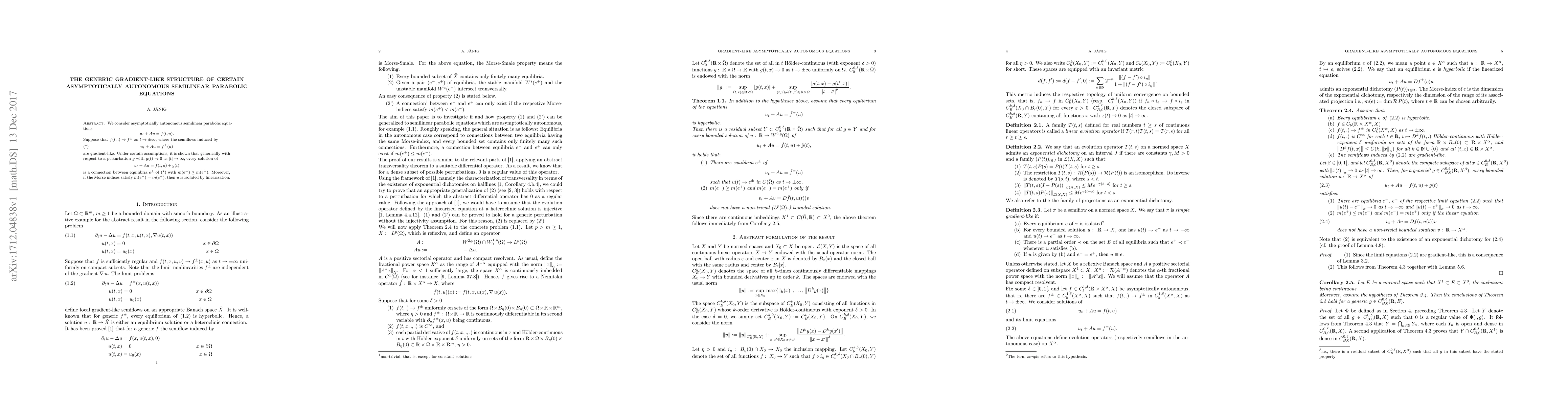 We consider asymptotically autonomous semilinear parabolic equations u_t + Au = f(t,u). Suppose that $f(t,.)\to f^\pm$ as $t\to\pm\infty$, where the semiflows induced by \label{eq:140602-1511} u_t + Au = f^\pm(u) \tag{*} are gradient-like. Under certain assumptions, it is shown that generically with respect to a perturbation $g$ with $g(t)\to 0$ as $|t|\to\infty$, every solution of u_t + Au = f(t,u) + g(t) is a connection between equilibria $e^\pm$ of \eqref{eq:140602-1511} with $m(e^-)\geq m(e^+)$. Moreover, if the Morse indices satisfy $m(e^-) = m(e^+)$, then $u$ is isolated by linearization.