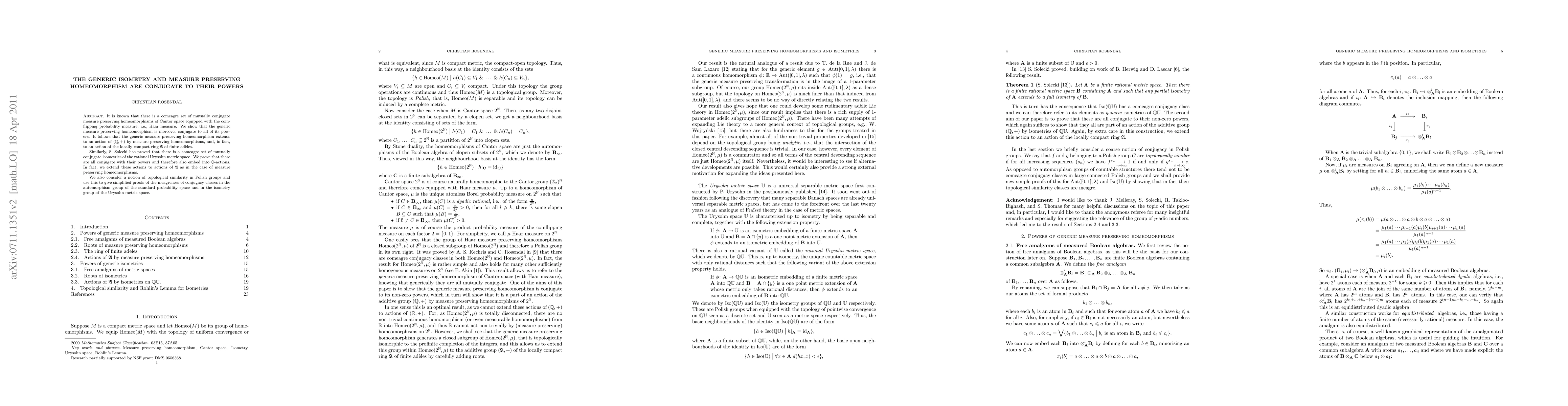 Research shows that generic measure-preserving homeomorphisms and isometries in certain spaces are conjugate to their powers, extending to actions of the adèles group, with implications for topological similarity and group theory.