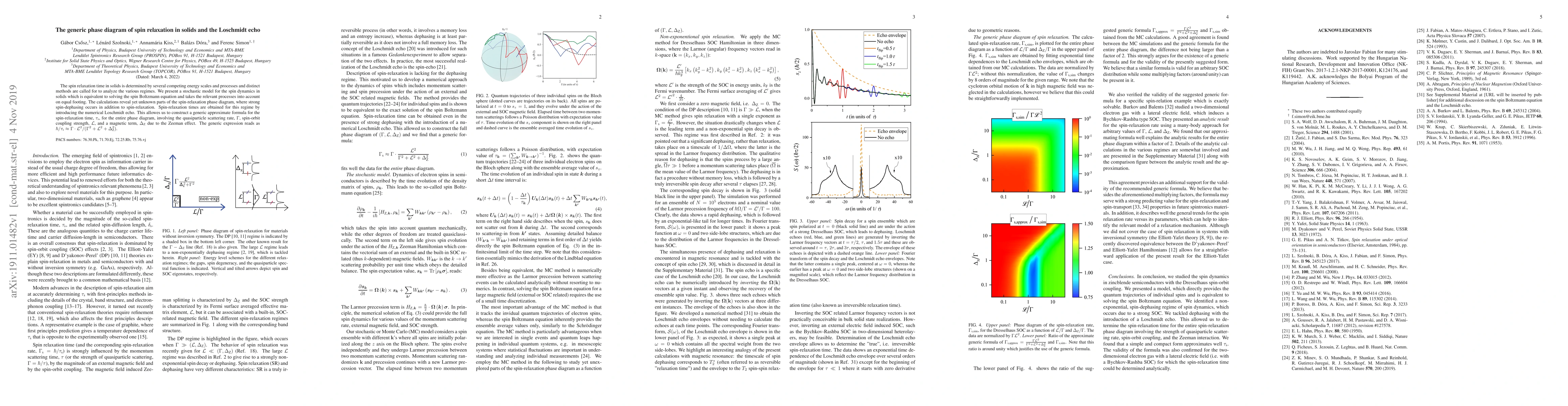 The paper introduces a stochastic model for spin dynamics in solids, equivalent to solving the spin Boltzmann equation. It uncovers new regions in the spin-relaxation phase diagram, identifying strong spin-dephasing alongside spin-relaxation. A numerical Loschmidt echo is used to calculate spin-relaxation times, leading to a generic formula for spin-relaxation time, $ au_{ ext{s}}$, involving quasiparticle scattering rate, spin-orbit coupling strength, and a magnetic term due to the Zeeman effect.