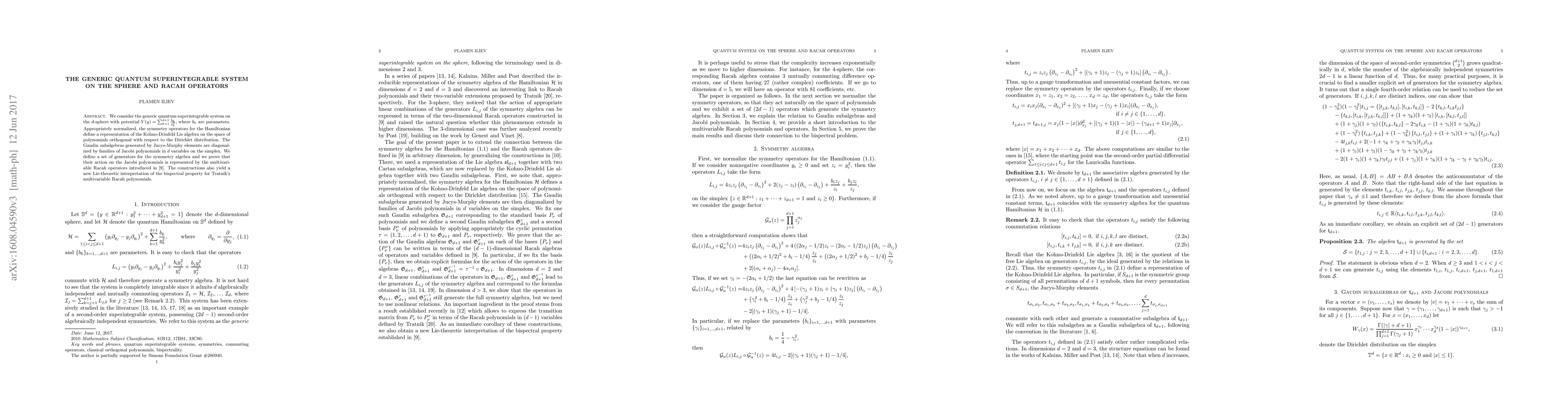 We consider the generic quantum superintegrable system on the $d$-sphere with potential $V(y)=\sum_{k=1}^{d+1}\frac{b_k}{y_k^2}$, where $b_k$ are parameters. Appropriately normalized, the symmetry operators for the Hamiltonian define a representation of the Kohno-Drinfeld Lie algebra on the space of polynomials orthogonal with respect to the Dirichlet distribution. The Gaudin subalgebras generated by Jucys-Murphy elements are diagonalized by families of Jacobi polynomials in $d$ variables on the simplex. We define a set of generators for the symmetry algebra and we prove that their action on the Jacobi polynomials is represented by the multivariable Racah operators introduced in arXiv:0705.1469. The constructions also yield a new Lie-theoretic interpretation of the bispectral property for Tratnik's multivariable Racah polynomials.