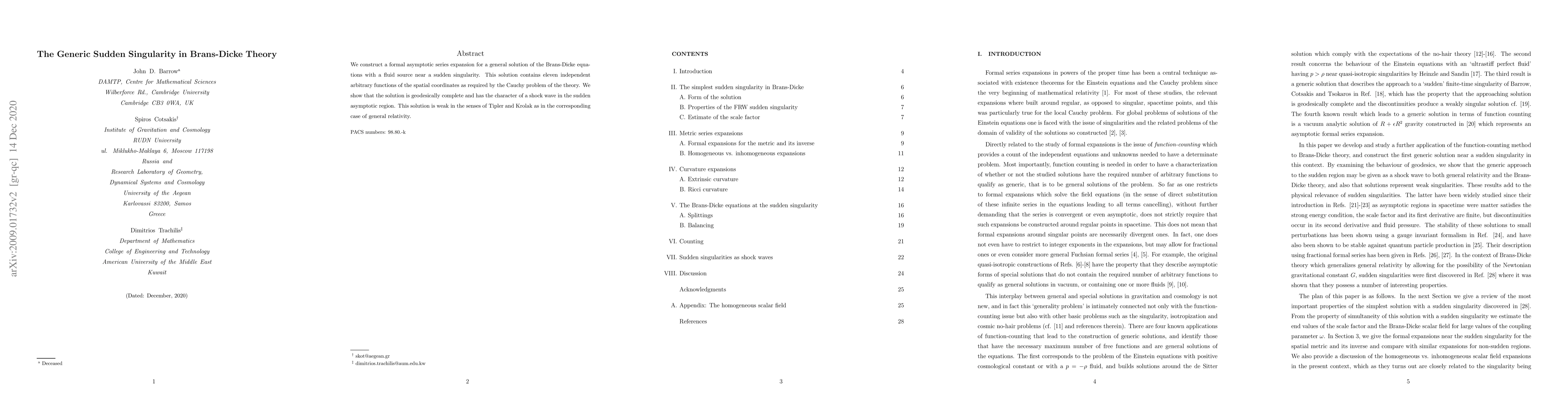 We construct a formal asymptotic series expansion for a general solution of the Brans-Dicke equations with a fluid source near a sudden singularity. This solution contains eleven independent arbitrary functions of the spatial coordinates as required by the Cauchy problem of the theory. We show that the solution is geodesically complete and has the character of a shock wave in the sudden asymptotic region. This solution is weak in the senses of Tipler and Krolak as in the corresponding case of general relativity.