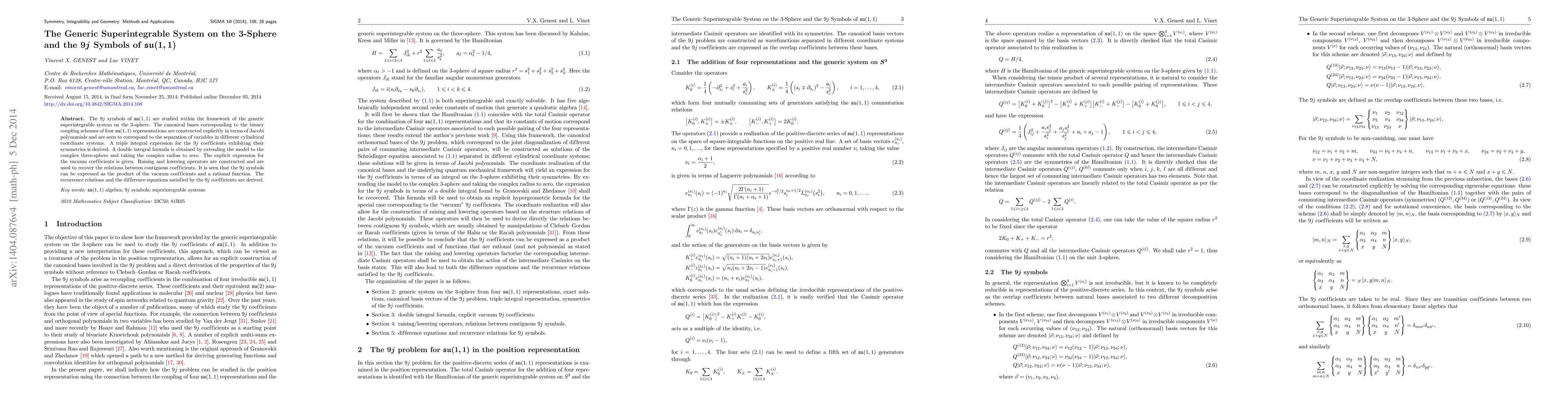 This paper explores the $9j$ symbols of $\mathfrak{su}(1,1)$ in the context of a generic superintegrable system on the 3-sphere, constructing canonical bases and deriving integral expressions for the $9j$ coefficients, ultimately showing their relation to vacuum coefficients and recurrence relations.
