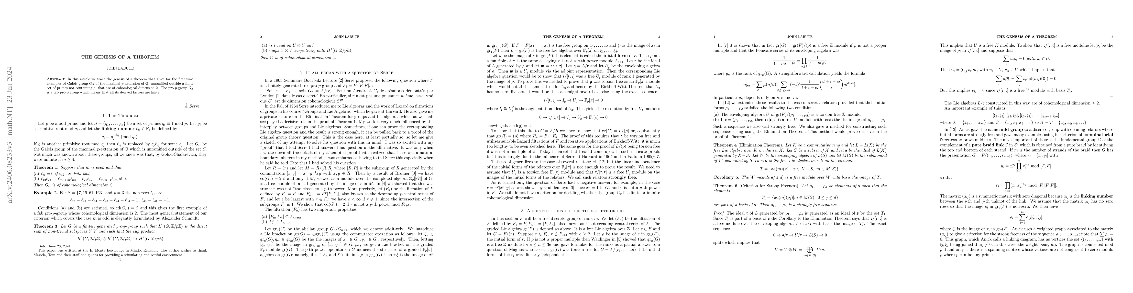 In this article we trace the genesis of a theorem that gives for the first time examples of Galois group $G_S$ of the maximal $p$-extension of $\mathbb{Q}$, unramified outside a finite set of primes not containing $p$, that are of cohomological dimension $2$. The pro-$p$-group $G_S$ is a fab pro-$p$-group which means that all its derived factors are finite.