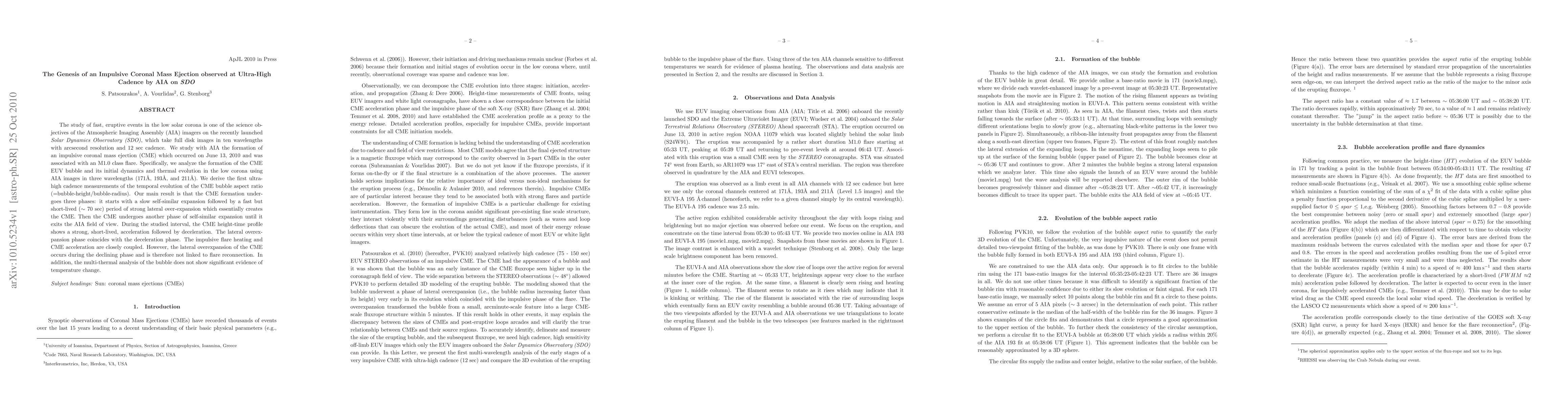 The study of fast, eruptive events in the low solar corona is one of the science objectives of the Atmospheric Imaging Assembly (AIA) imagers on the recently launched Solar Dynamics Observatory (SDO), which take full disk images in ten wavelengths with arcsecond resolution and 12 sec cadence. We study with AIA the formation of an impulsive coronal mass ejection (CME) which occurred on June 13, 2010 and was associated with an M1.0 class flare. Specifically, we analyze the formation of the CME EUV bubble and its initial dynamics and thermal evolution in the low corona using AIA images in three wavelengths (171, 193 and 211 A). We derive the first ultra-high cadence measurements of the temporal evolution of the CME bubble aspect ratio (=bubble-height/bubble-radius). Our main result is that the CME formation undergoes three phases: it starts with a slow self-similar expansion followed by a fast but short-lived (~ 70 sec) period of strong lateral over-expansion which essentially creates the CME. Then the CME undergoes another phase of self-similar expansion until it exits the AIA field of view. During the studied interval, the CME height-time profile shows a strong, short-lived, acceleration followed by deceleration. The lateral overexpansion phase coincides with the deceleration phase. The impulsive flare heating and CME acceleration are closely coupled. However, the lateral overexpansion of the CME occurs during the declining phase and is therefore not linked to flare reconnection. In addition, the multi-thermal analysis of the bubble does not show significant evidence of temperature change.