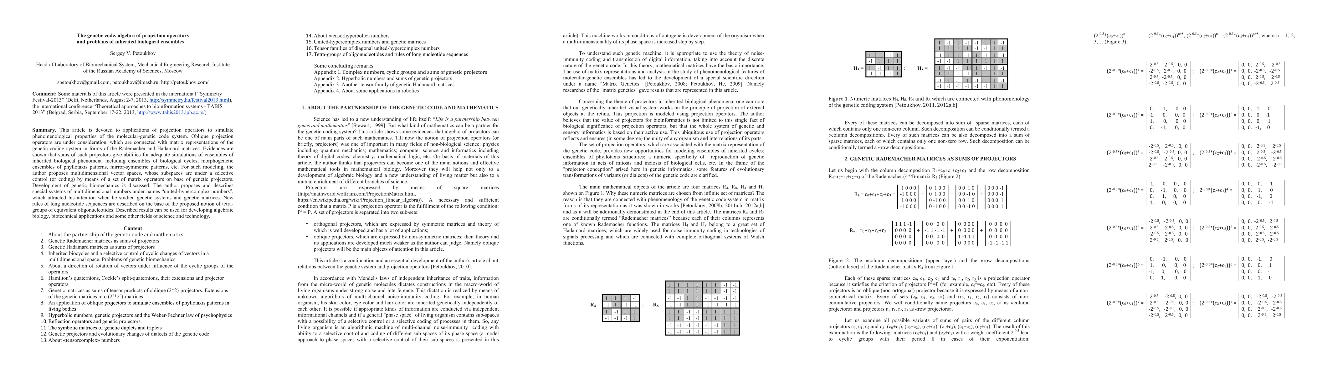 This paper explores the use of oblique projection operators, linked to Rademacher and Hadamard matrices, to simulate the molecular-genetic code system. It proposes a method for modeling inherited biological phenomena using multidimensional vector spaces and introduces united-hypercomplex numbers to describe long nucleotide sequences, aiming to advance algebraic biology and bio-technical applications.