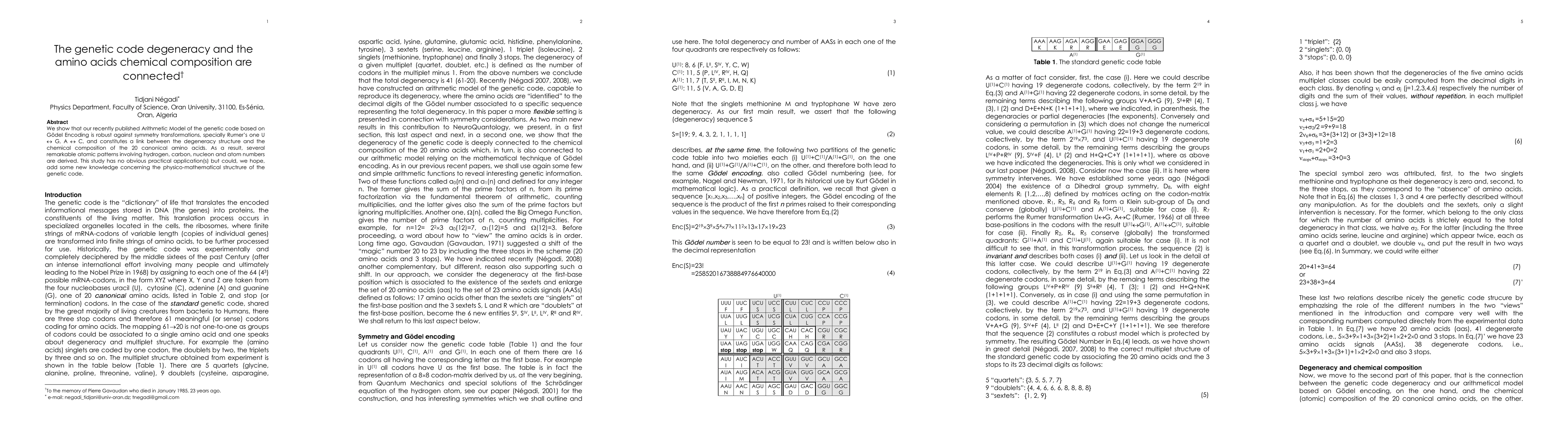We show that our recently published Arithmetic Model of the genetic code based on Godel Encoding is robust against symmetry transformations, specially Rumer s one U > G, A > C, and constitutes a link between the degeneracy structure and the chemical composition of the 20 canonical amino acids. As a result, several remarkable atomic patterns involving hydrogen, carbon, nucleon and atom numbers are derived. This study has no obvious practical application(s) but could, we hope, add some new knowledge concerning the physico-mathematical structrure of the genetic code.