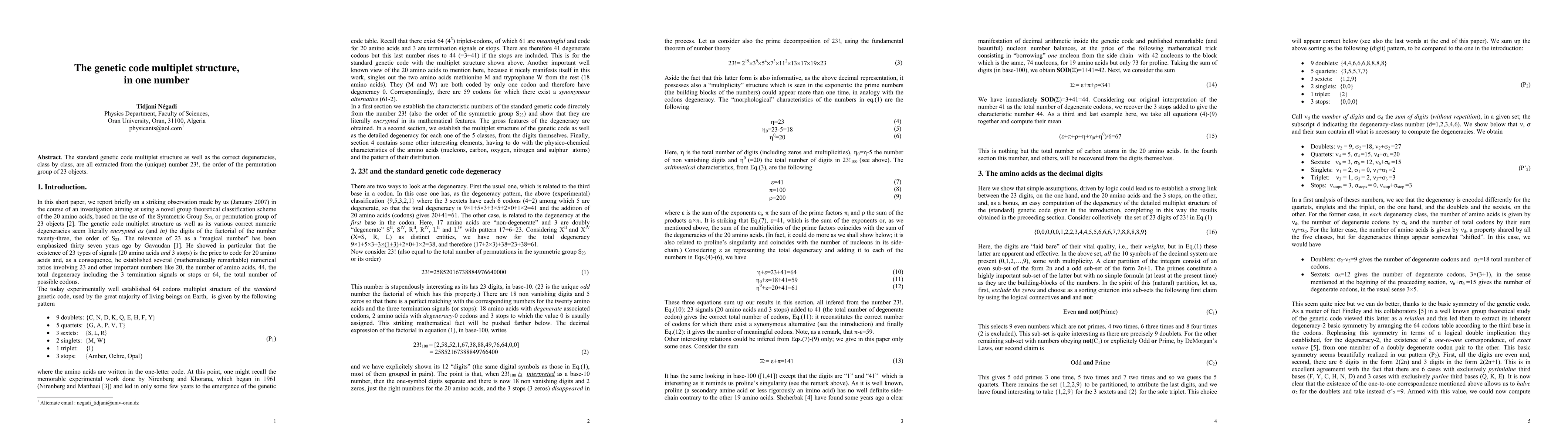 The paper demonstrates that the standard genetic code's multiplet structure and degeneracies can be derived from the number 23, specifically linked to the permutation group's order of 23 objects. This finding suggests a deeper mathematical relationship underlying the genetic code.