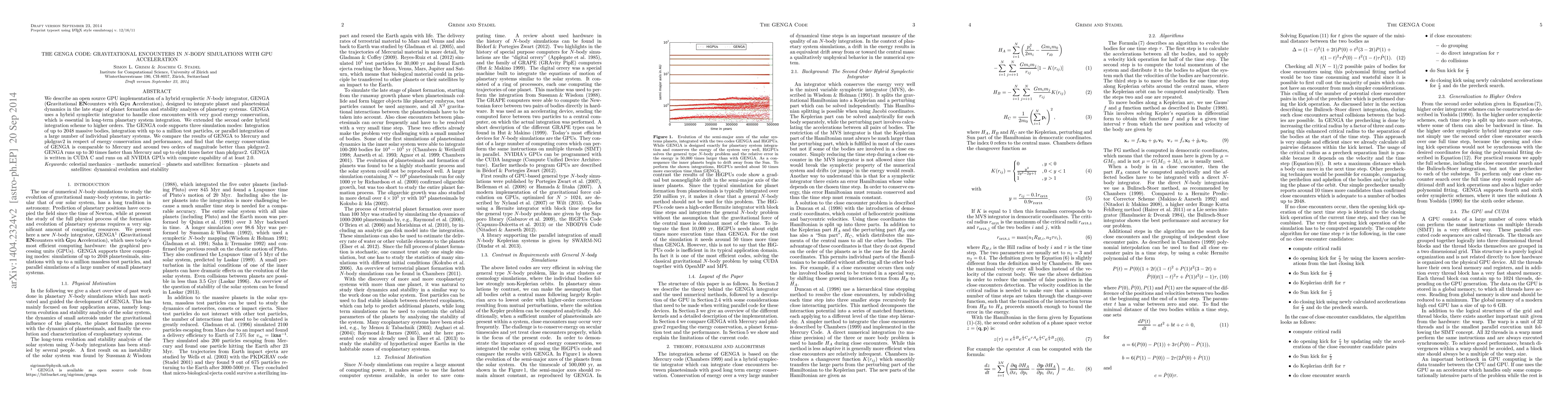 The GENGA code is an open-source GPU-accelerated hybrid symplectic N-body integrator designed for simulating planet and planetesimal dynamics, offering superior energy conservation and performance compared to Mercury and pkdgrav2. It supports various simulation modes and runs significantly faster on compatible NVIDIA GPUs.