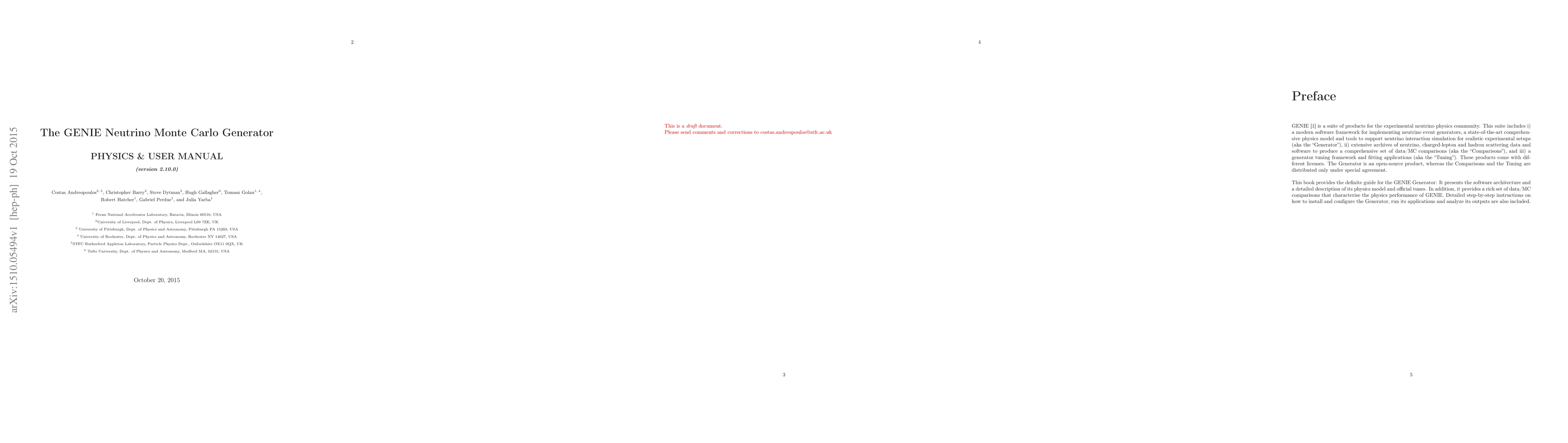 GENIE is a neutrino Monte Carlo generator that provides a comprehensive physics model, software framework, and tools for simulating neutrino interactions in realistic experimental setups. It includes a Generator product, Comparisons product, and Tuning product.