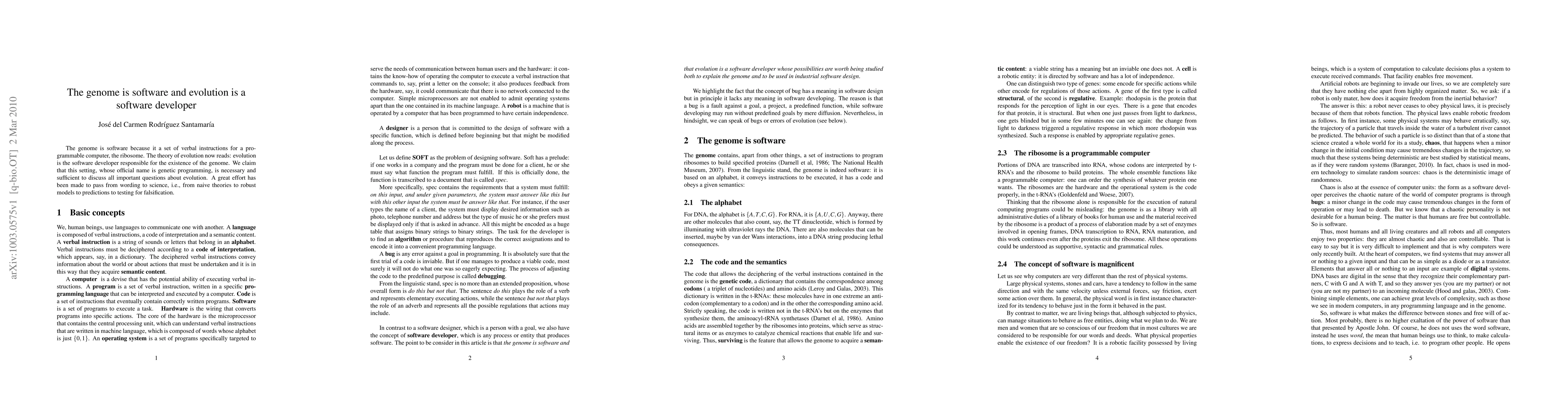 The genome is software because it a set of verbal instructions for a programmable computer, the ribosome. The theory of evolution now reads: evolution is the software developer responsible for the existence of the genome. We claim that this setting, whose official name is genetic programming, is necessary and sufficient to discuss all important questions about evolution. A great effort has been made to pass from wording to science, i.e., from naive theories to robust models to predictions to testing for falsification.