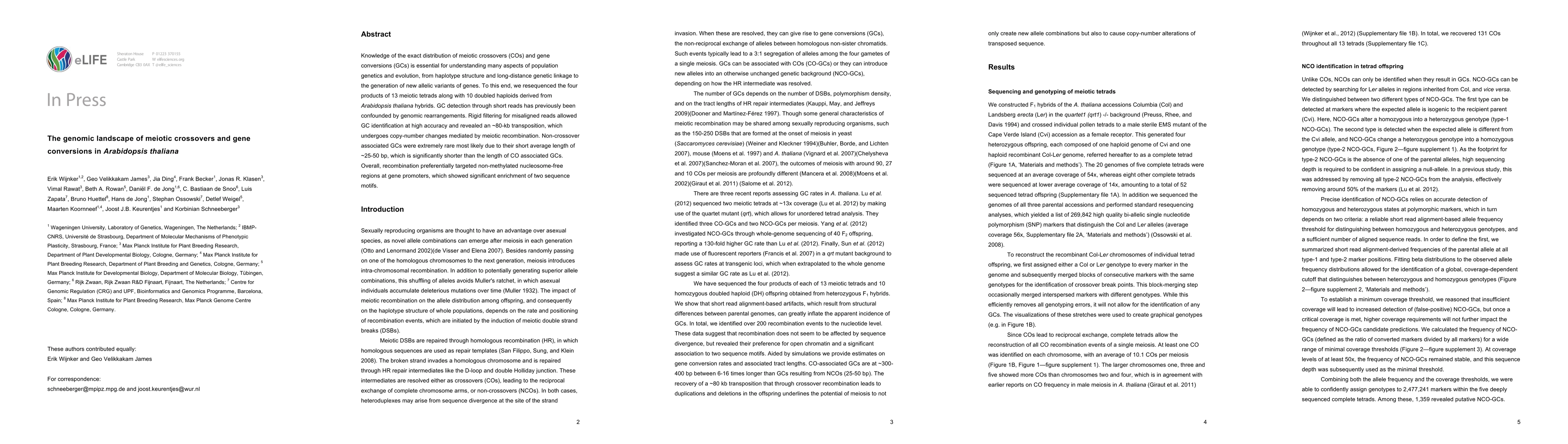 This study resequenced meiotic products from Arabidopsis thaliana to map crossovers and gene conversions, revealing that recombination favors non-methylated, nucleosome-free regions at gene promoters and that non-crossover associated gene conversions are rare due to their short length.
