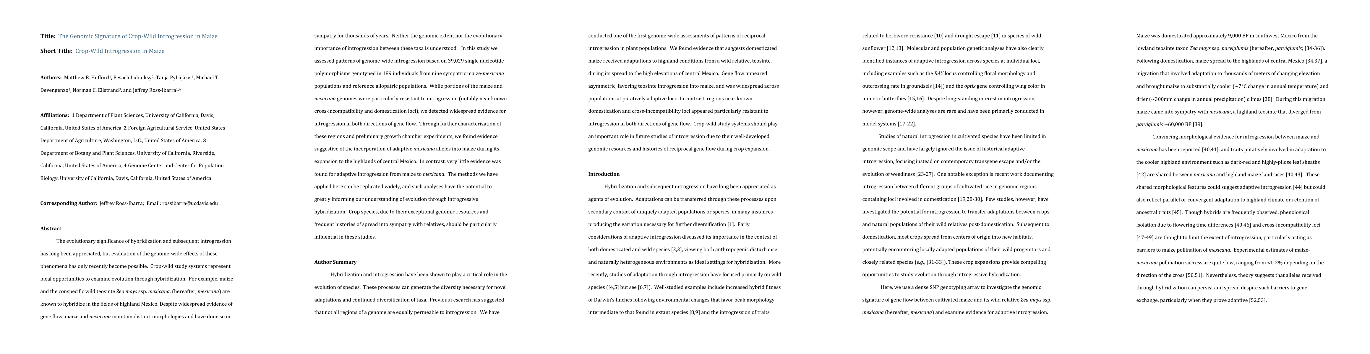 This study examines genome-wide introgression between maize and its wild relative teosinte using SNP genotyping, revealing widespread bidirectional gene flow despite distinct morphologies. It suggests adaptive introgression from teosinte to maize, highlighting the evolutionary significance of hybridization in crop-wild systems.
