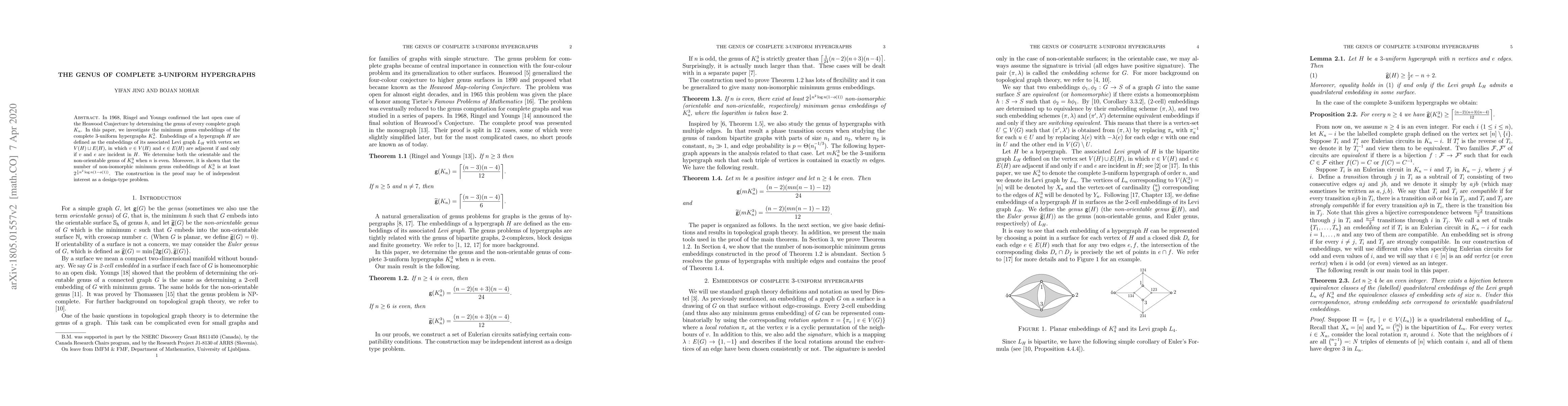 In 1968, Ringel and Youngs confirmed the last open case of the Heawood Conjecture by determining the genus of every complete graph $K_n$. In this paper, we investigate the minimum genus embeddings of the complete $3$-uniform hypergraphs $K_n^3$. Embeddings of a hypergraph $H$ are defined as the embeddings of its associated Levi graph $L_H$ with vertex set $V(H)\sqcup E(H)$, in which $v\in V(H)$ and $e\in E(H)$ are adjacent if and only if $v$ and $e$ are incident in $H$. We determine both the orientable and the non-orientable genus of $K_n^3$ when $n$ is even. Moreover, it is shown that the number of non-isomorphic minimum genus embeddings of $K_n^3$ is at least $2^{\frac{1}{4}n^2\log n(1-o(1))}$. The construction in the proof may be of independent interest as a design-type problem.