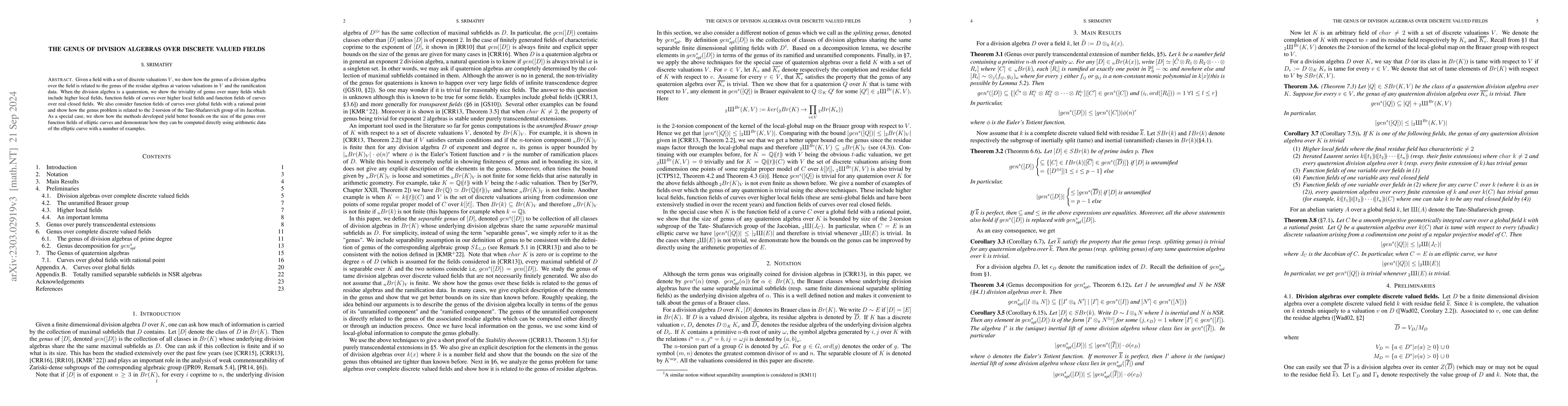 This paper investigates the genus of division algebras over discrete valued fields, showing connections to residue algebras and ramification data. It demonstrates that quaternion division algebras are trivial in genus over various fields, and relates the genus problem to the $2$-torsion of the Tate-Shafarevich group for function fields, providing better bounds and direct computation methods for genus over elliptic curves.