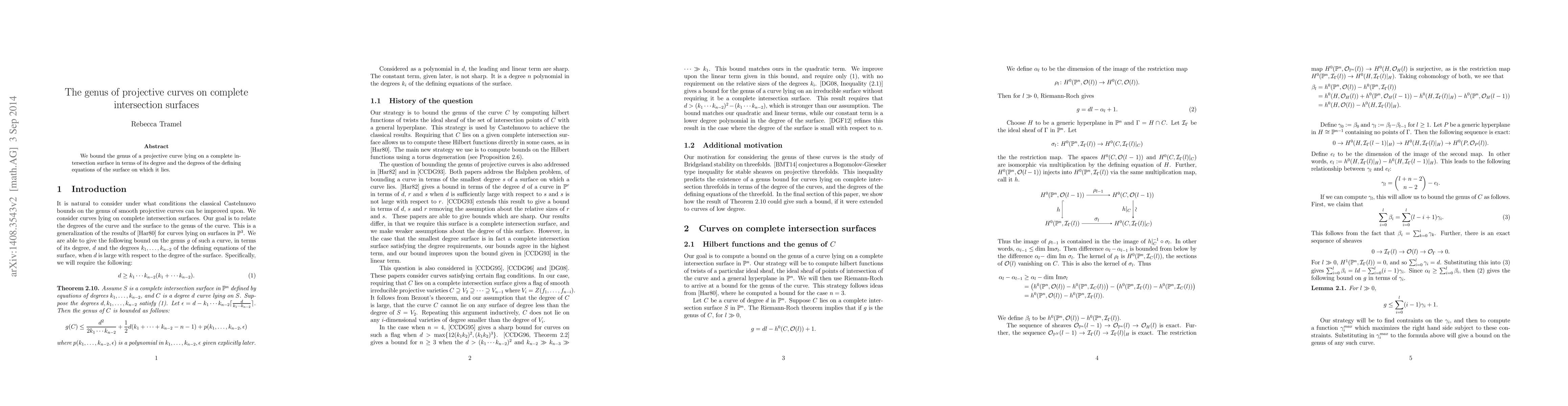 Summary: This paper provides a method to determine the genus of projective curves on complete intersection surfaces by relating it to the curve's degree and the degrees of the surface's defining equations. The findings offer a useful bound for the genus in these geometric contexts.