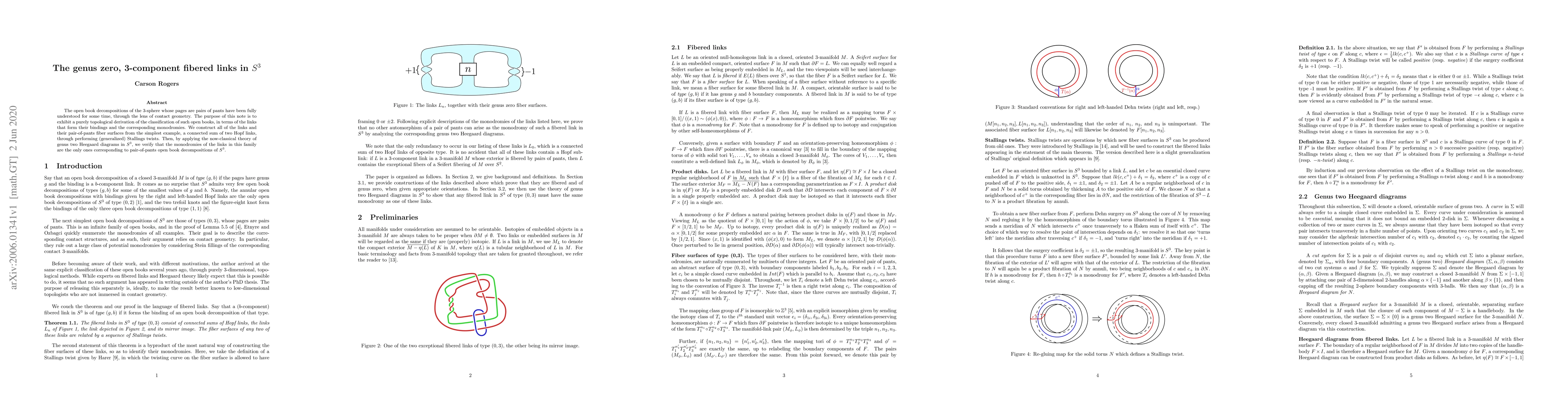 This paper presents a topological derivation for classifying open book decompositions of $S^3$ with pair-of-pants pages, focusing on genus zero, 3-component fibered links. It constructs these links via generalized Stallings twists starting from a connected sum of Hopf links and verifies their monodromies using genus two Heegaard diagrams.