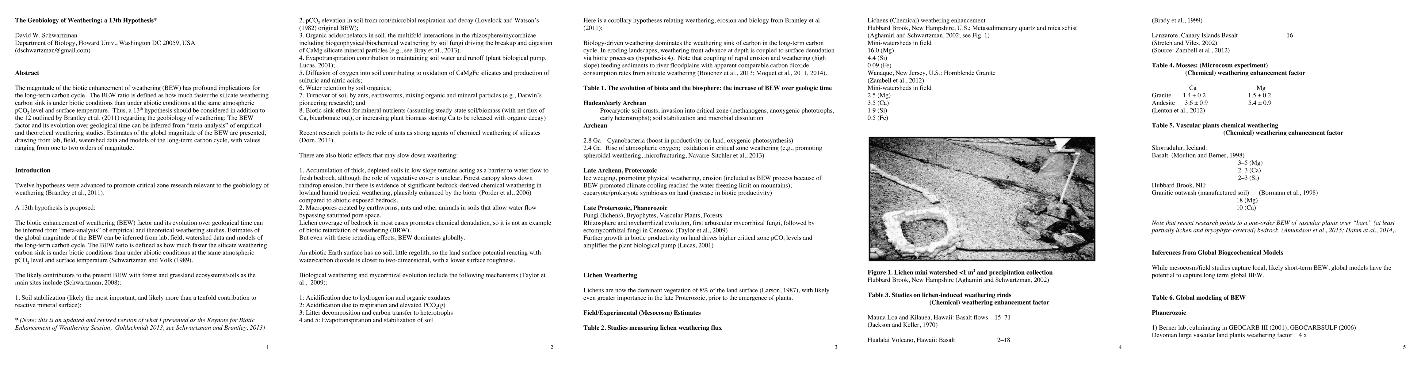 The magnitude of the biotic enhancement of weathering (BEW) has profound implications for the long-term carbon cycle. The BEW ratio is defined as how much faster the silicate weathering carbon sink is under biotic conditions than under abiotic conditions at the same atmospheric pCO2 level and surface temperature. Thus, a 13th hypothesis should be considered in addition to the 12 outlined by Brantley...(2011) regarding the geobiology of weathering: The BEW factor and its evolution over geological time can be inferred from meta-analysis of empirical and theoretical weathering studies. Estimates of the global magnitude of the BEW are presented, drawing from lab, field, watershed data and models of the long-term carbon cycle, with values ranging from one to two orders of magnitude.
