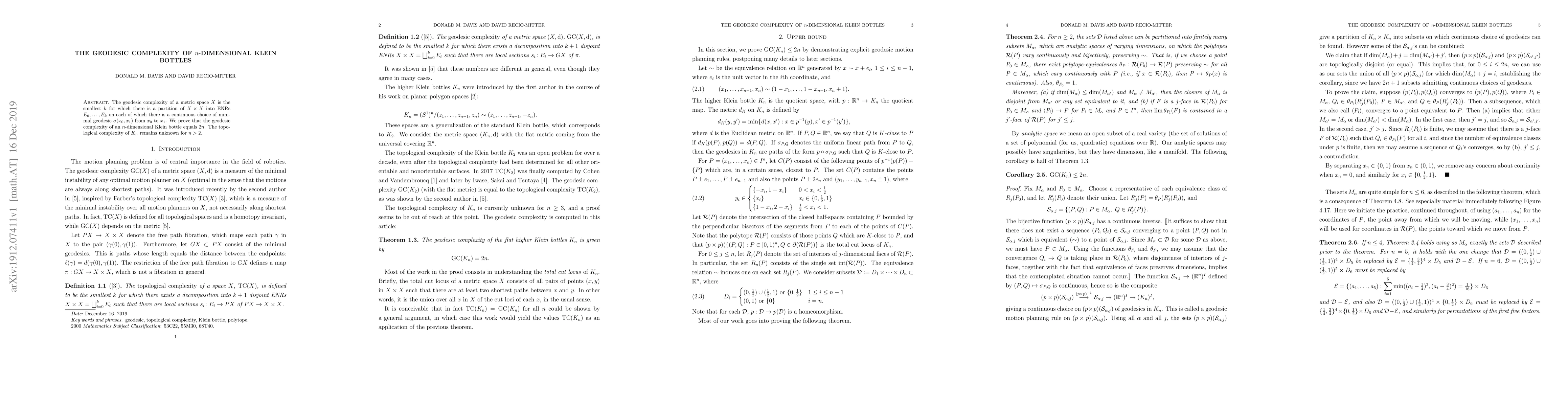 The geodesic complexity of a metric space X is the smallest k for which there is a partition of X x X into ENRs E_0,...,E_k on each of which there is a continuous choice of minimal geodesic sigma(x_0,x_1) from x_0 to x_1. We prove that the geodesic complexity of an n-dimensional Klein bottle equals 2n. Its topological complexity remains unknown for n>2.