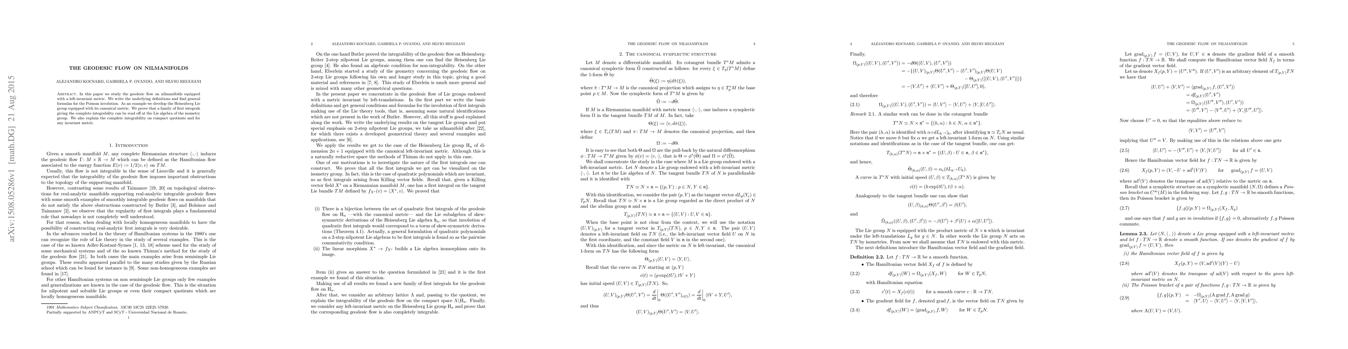 In this paper we study the geodesic flow on nilmanifolds equipped with a left-invariant metric. We write the underlying definitions and find general formulas for the Poisson involution. As an example we develop the Heisenberg Lie group equipped with its canonical metric. We prove that a family of first integrals giving the complete integrability can be read off at the Lie algebra of the isometry group. We also explain the complete integrability on compact quotients and for any invariant metric.
