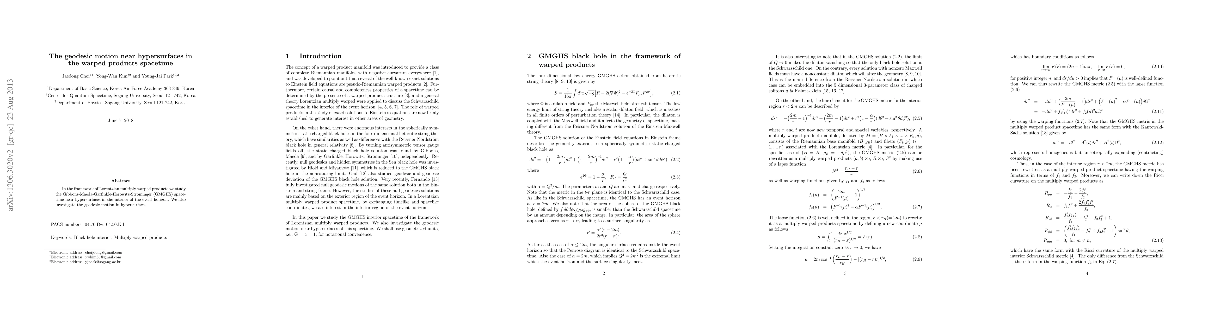 In the framework of Lorentzian multiply warped products we study the Gibbons-Maeda-Garfinkle-Horowitz-Strominger (GMGHS) spacetime near hypersurfaces in the interior of the event horizon. We also investigate the geodesic motion in hypersurfaces.