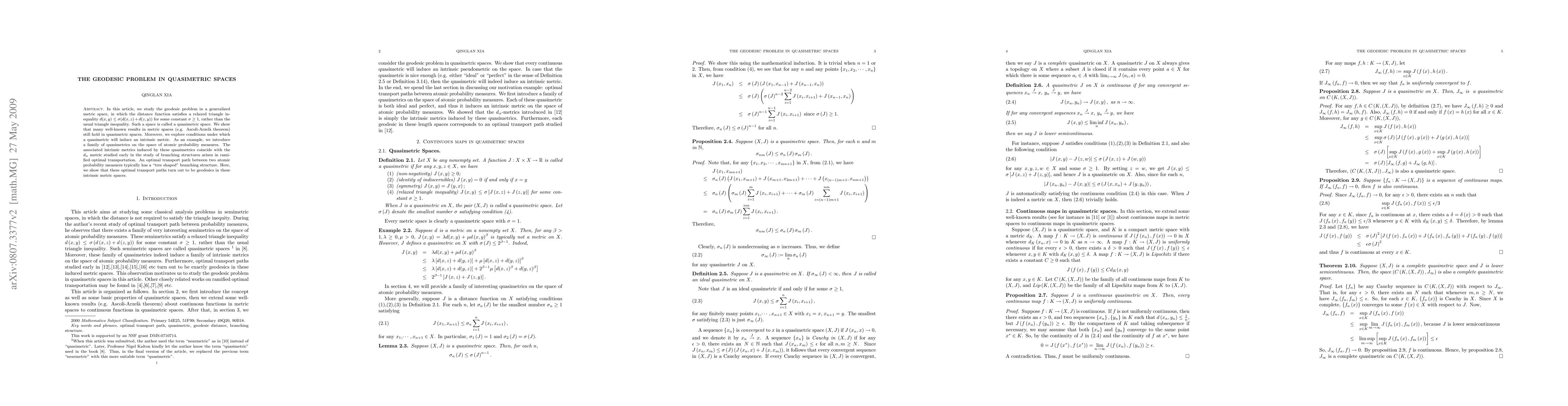 In this article, we study the geodesic problem in a generalized metric space, in which the distance function satisfies a relaxed triangle inequality $d(x,y)\leq \sigma (d(x,z)+d(z,y))$ for some constant $\sigma \geq 1$, rather than the usual triangle inequality. Such a space is called a quasimetric space. We show that many well-known results in metric spaces (e.g. Ascoli-Arzel\`{a} theorem) still hold in quasimetric spaces. Moreover, we explore conditions under which a quasimetric will induce an intrinsic metric. As an example, we introduce a family of quasimetrics on the space of atomic probability measures. The associated intrinsic metrics induced by these quasimetrics coincide with the $d_{\alpha}$ metric studied early in the study of branching structures arisen in ramified optimal transportation. An optimal transport path between two atomic probability measures typically has a "tree shaped" branching structure. Here, we show that these optimal transport paths turn out to be geodesics in these intrinsic metric spaces.