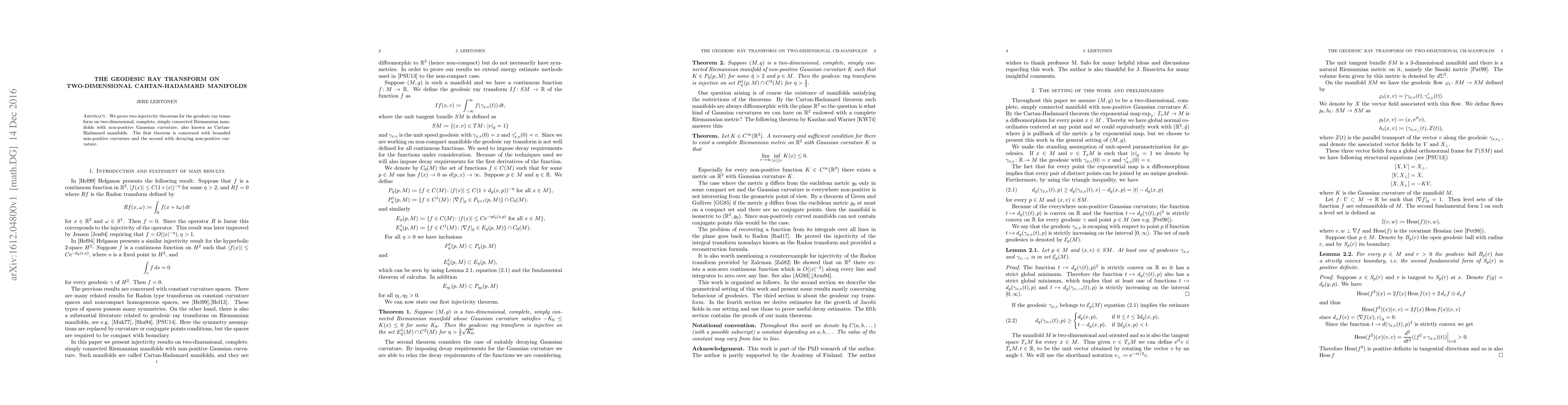 Summary: This paper proves two injectivity theorems for the geodesic ray transform on two-dimensional Cartan-Hadamard manifolds, addressing bounded and decaying non-positive curvature scenarios respectively.