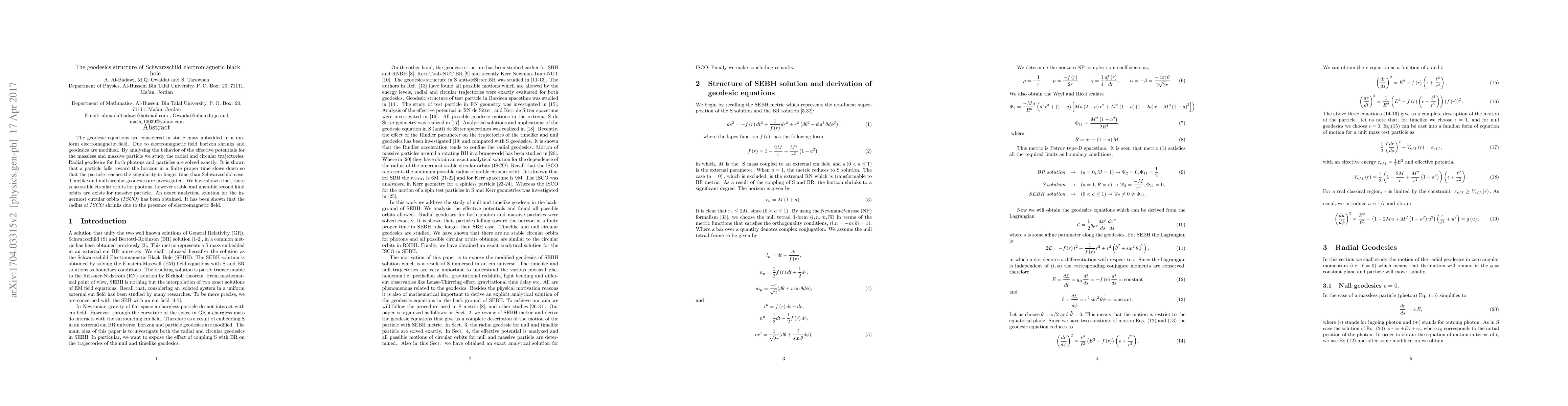 This paper examines the geodesic structure of a Schwarzschild black hole influenced by a uniform electromagnetic field, showing that the horizon shrinks and modifies geodesics. It finds that particles fall toward the horizon in finite proper time, taking longer than in the Schwarzschild case, and reveals no stable circular orbits for photons but stable and unstable orbits for massive particles, with the radius of the innermost stable circular orbit (ISCO) shrinking due to the electromagnetic field.