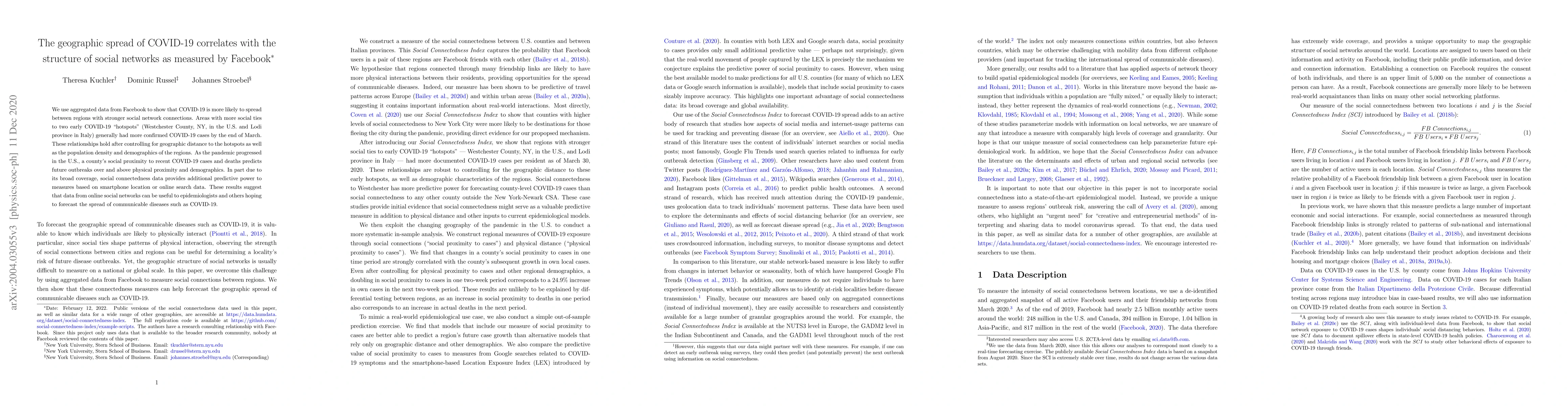 This study demonstrates that the geographic spread of COVID-19 correlates strongly with the structure of social networks, particularly as measured by Facebook. The research finds that regions with stronger social ties to early COVID-19 hotspots had higher case numbers, highlighting the predictive power of social network data for forecasting disease spread.