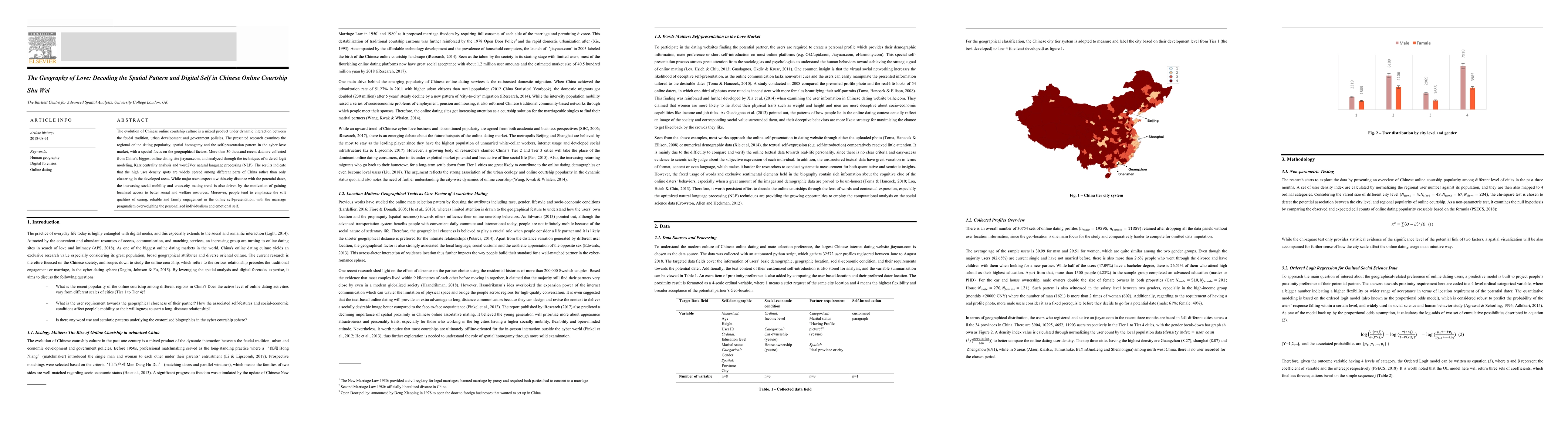 Chinese online dating shows high user density in various parts of China, not just urban areas, with a focus on caring qualities and social resources.